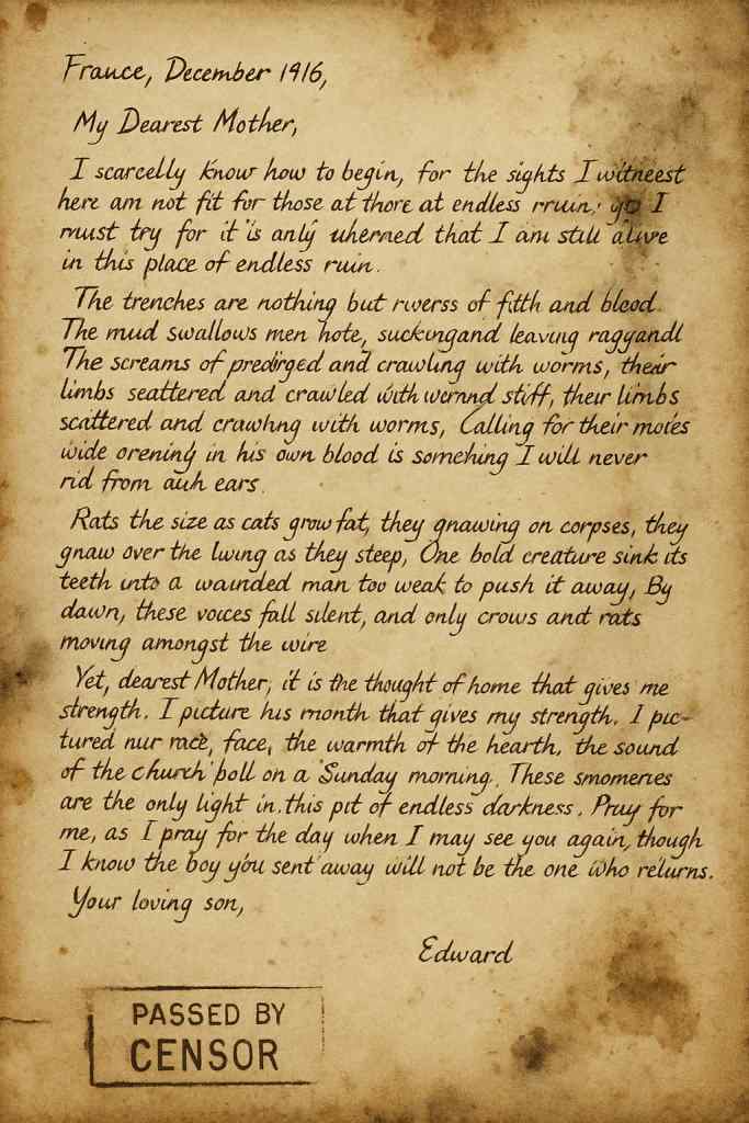 My Dearest Mother, I scarcely know how to begin, for the sights I witness here are not fit for the eyes of those at home. Yet I must write, if only to let you know that I am still alive in this place of endless ruin. The trenches are nothing but rivers of filth and blood. The mud swallows men whole, sucking them down like quicksand until only a hand or boot remains above the surface. The ground is littered with broken rifles, helmets, and the bodies of comrades who fell days ago and now lie bloated and stiff, their faces twisted and crawling with worms. Some stare with eyes wide open, as though still calling out in terror. Others are torn into pieces by the shells, their limbs scattered like broken dolls. I have seen men carried back who were little more than a sack of torn flesh. When the bombardments come, the world erupts. The earth shatters under us, flinging men into the air like ragdolls. Shrapnel slices through bodies as if they were paper. The screams of the wounded rise above the thunder, men clutching at wounds that spill their life out into the mud, calling for their mothers, begging for water, for mercy, for the end. The sound of a man drowning in his own blood is something I will never rid from my ears. Rats the size of cats grow fat here. They gnaw at the corpses, tearing strips from faces and hands, and even crawl over the living as we sleep. One bold creature sank its teeth into a wounded man too weak to push it away. The lice torment us endlessly, burrowing into our seams, leaving us raw and scratching until our skin bleeds. But it is the nights after an attack that torment me most. Out in No Man’s Land, caught in the wire, the voices of the dying carry through the dark. They call all night for help we cannot give. “Mother… mother…” that cry echoes above all. By dawn, the voices fall silent, and only the crows and rats move amongst the wire. Yet, dearest Mother, it is the thought of home that gives me strength. I picture your face, the warmth of the hearth, the sound of the church bell on a Sunday morning. These small memories are the only light in this pit of endless darkness. Pray for me, as I pray for the day when I may see you again, though I know the boy you sent away will not be the one who returns. Your loving son, Edward.