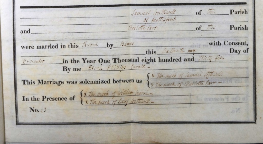 On a cool November day, the 16th day of November, 1835, Henry’s sister Charlotte Carr, the daughter of John and Elizabeth Carr, stepped forward at St. Peter’s Church in East Tytherley to marry Samuel Southwell, a man from the neighboring parish of Mottisfont. The church, as it had done for countless generations, served as the sacred space where two lives were united before God, family, and the community. The ceremony was held by the revered Curate Edward Phillips, who, having overseen the banns for several Sundays prior, now had the honor of officiating this joyful occasion. The couple, surrounded by their closest witnesses, William Marsh and Lucy Southwell, exchanged vows, committing themselves to one another in a union that would shape their futures. The marriage was formalized by banns, which had been published over three consecutive Sundays, and on this day, it was sealed in the presence of the village. The names of Charlotte and Samuel, along with those of their witnesses, William and Lucy, were carefully recorded in the church’s register. An interesting detail about this entry is that all four individuals, Charlotte, Samuel, William, and Lucy, signed the official document with their marks, an "X," a testament to the time when literacy was not as widespread as it would later become. While many of the records in the church register were signed in elegant handwriting, the mark of the "X" was no less significant, standing as a symbol of commitment and a pledge to the vows made that day. Curate Phillips, with steady hands and a practiced eye, wrote the marriage details in the register: “Charlotte Carr of the parish of East Tytherley and Samuel Southwell of the parish of Mottisfont were married in the parish of East Tytherley at St. Peter’s Church by banns on Monday the 16th November 1835.” The official record of their union would endure through time, a small yet profound moment that would one day be discovered by those tracing the paths of family histories. The wedding, though modest in ceremony, was rich in significance. For Charlotte, it marked the end of one chapter of her life, the familiar world of childhood and home, and the beginning of another, one in which she would share her life with Samuel. Together, they would create a new family, bound by love and commitment. For the village of East Tytherley, the marriage of Charlotte and Samuel was another thread woven into the larger fabric of its history, a shared moment for the community to witness, celebrate, and remember. In the quiet of St. Peter’s Church, the vows were spoken, the marks were made, and a new chapter in the Carr family’s story began. The echoes of that day, though faint now with the passage of time, continue to live on in the records, in the memories of those who witnessed it, and in the enduring love that Charlotte and Samuel would share as they embarked on their new life together.