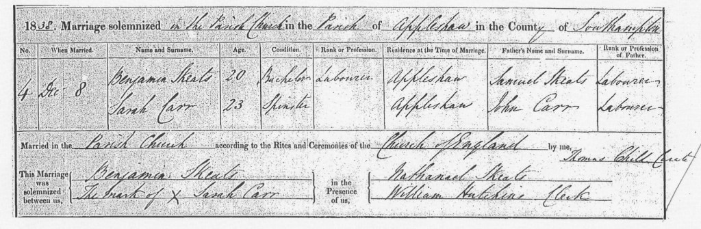 On Saturday, the 8th day of December, 1838, the quiet village of Appleshaw, Hampshire, witnessed a union that would forever join the lives of Henry’s sister Sarah Jane Carr and Benjamin Skeats. St. Peter in the Wood Church, with its timeless beauty, stood as the backdrop for this momentous occasion, a ceremony marking the beginning of a new chapter for both Sarah and Benjamin. Sarah Jane Carr, at 23 years old, was a spinster from Appleshaw, and on that winter’s day, she stood with her heart full of hope and anticipation. Beside her was Benjamin Skeats, a 20-year-old bachelor, a labourer, whose life had been rooted in the same village, the same rhythms of rural life. Both Sarah and Benjamin, though from humble backgrounds, carried the legacy of their families, bound to one another by love and shared experiences in the small but tight-knit community of Appleshaw. The ceremony was conducted by Curate Thomas Chill, who, as the officiant, guided them through the vows that would forever bind their lives together. With reverence, he carefully recorded the details of the marriage in the church register, marking the moment when Sarah and Benjamin became husband and wife. The entry reads: "On the 8th December 1838, in the parish church of Appleshaw, 23-year-old spinster Sarah Jane Carr of Appleshaw married 20-year-old bachelor Benjamin Skeats, a Labourer of Appleshaw. Sarah was the daughter of John Carr, a Labourer, and Benjamin was the son of Samuel Skeats, a Labourer." The simplicity of their professions, both as labourers, reflected the lives they had lived and would continue to live, marked by hard work and the steady hand of daily life. Their families were tied by the land, their labor a reflection of the deep connection they had to their home. Their witnesses, Nathanael Skeats and William Hutchins, were present not only to sign the document but to bear witness to this significant event in the lives of Sarah and Benjamin. It was common for those closest to the couple to stand by them on such an important day, offering their support and witnessing the promise of lifelong commitment. The act of signing the register, though formal and practical, was also deeply symbolic. Sarah and Benjamin would not have signed their names, but instead would have made their mark, an "X" a reminder of the many in their community who, though not literate in the traditional sense, knew the importance of this moment, their vows of love and commitment sealed with the most profound of promises. The "X" was their mark of trust, of faith, of a future built together. In the small church at Appleshaw, on that cold December day, Sarah Jane Carr and Benjamin Skeats were united before God, their families, and their community. The echoes of the ceremony would live on in the hearts of those who were present, in the records that would survive through time, and in the lives Sarah and Benjamin would build together, as husband and wife. Their story, like many others, began simply, yet it was a beginning that carried with it the hopes and dreams of a future that would unfold through the years, marked by the love and partnership they pledged that day.