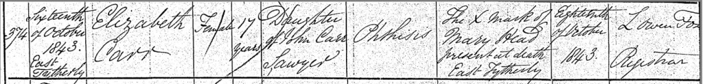 On Sunday, the 22nd day of October, 1843, Elizabeth Carr, beloved daughter of John and Elizabeth Carr and sister of Henry, was laid to rest in the peaceful grounds of St. Peter’s Churchyard in East Tytherley. Her burial marked the end of a brief but poignant life, one that was taken too soon by the cruel grasp of phthisis, or tuberculosis. The ceremony, though filled with sorrow, was carried out with the reverence and solemnity befitting the final act of love and respect for a life lost. The minister, Edward Phillips, who had guided the community through many such moments, performed the burial service. In the stillness of the churchyard, surrounded by the beauty of the Hampshire countryside, Elizabeth was laid to rest in the earth, where generations of East Tytherley’s residents had been buried before her. Edward Phillips, as was his duty, recorded the details of Elizabeth’s burial in the church’s burial register. His entry simply but profoundly states: “On the 22nd October 1843 in East Tytherley, 17-year-old Elizabeth Carr of East Tytherley was buried.” These few words in the register serve as a quiet memorial to a young life lost, capturing the moment in time when Elizabeth’s earthly journey ended, and she was laid to rest among the others in the peaceful churchyard. As her family, her parents, siblings, and the community of East Tytherley, gathered to say their final goodbyes, the weight of the loss would have been felt deeply. Elizabeth, a bright young woman with her whole future ahead of her, was taken far too early, leaving a lasting gap in the lives of those who loved her. The burial at St. Peter’s Churchyard, though filled with sorrow, would also have been a moment of quiet reflection, a reminder of the fragility of life, and the importance of cherishing those we hold dear. Elizabeth’s resting place, marked by the simplicity and beauty of the churchyard, became a lasting testament to her life, to the Carr family’s love for her, and to the grief they carried as they moved forward without her. In the years to come, Elizabeth’s memory would live on in the hearts of those who knew her, and the record of her burial would stand as a poignant reminder of the pain and beauty of life in East Tytherley, a life that was too briefly lived but never forgotten.