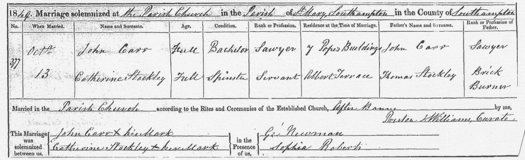 On Saturday, the 13th day of October, 1849, John Carr, Henry’s older brother, embarked on a new chapter of his life, marrying Catherine Shockley at St. Mary’s Church in Southampton, Hampshire. The church, standing as a witness to countless unions, was the perfect backdrop for the joining of John, a 24-year-old bachelor, and Catherine, a 22-year-old spinster, as they exchanged vows and began their shared journey. The marriage ceremony was conducted by Curate P.J. Williams, who had the honor of uniting John and Catherine in front of their family and friends. The union was marked by a simple yet profound moment, the joining of two lives in the eyes of God and community. As was customary at the time, the details of the marriage were logged in the church’s marriage register, carefully documented for posterity. Curate Williams recorded: “On October 13th, 1849, at The Parish Church of St. Mary’s, Southampton, Bachelor John Carr, a sewyer of Number 7, Popes Building, son of John Carr, a sewyer, married spinster Catherine Shockley, a servant of Albert Terrace, daughter of Thomas Shockley, a Brick Burner.” This simple entry holds a world of detail about John and Catherine’s lives. John Carr, like his father, worked as a sewyer, a craftsman in leather, a trade passed down through the generations. He lived at Number 7, Popes Building in Southampton, perhaps in a modest home where the marks of family and work shaped the daily rhythms of life. Catherine Shockley, on the other hand, was a servant, a young woman who, through her work, would have formed close bonds with the people she served, as was common at the time. Her father, Thomas Shockley, worked as a brick burner, an essential trade that tied him to the growing industrial world of the 19th century. Both John and Catherine were of full age, legally able to marry without parental consent, marking them as adults stepping fully into the responsibilities of marriage. Their witnesses, George Newman and Sophia Robert’s, were likely close friends or family members who stood by their side on this significant day. The presence of witnesses was a way of validating the ceremony, ensuring that it was a public and legally binding union. The day, filled with the quiet joy of two people making lifelong vows to one another, was a turning point for both John and Catherine. They were no longer just the son of John Carr and the daughter of Thomas Shockley; they were now a couple, ready to forge their future together. Their marriage, recorded in the parish records of St. Mary’s Church, would be a lasting reminder of their commitment to each other and their shared journey into the future. As they left the church that day, John and Catherine Carr embarked on a life filled with promise, marked by the love and companionship they had pledged to one another. Their union, though simple in its details, was rich with meaning, binding them together not only in the eyes of the law but also in the hearts of their families and the community of Southampton.