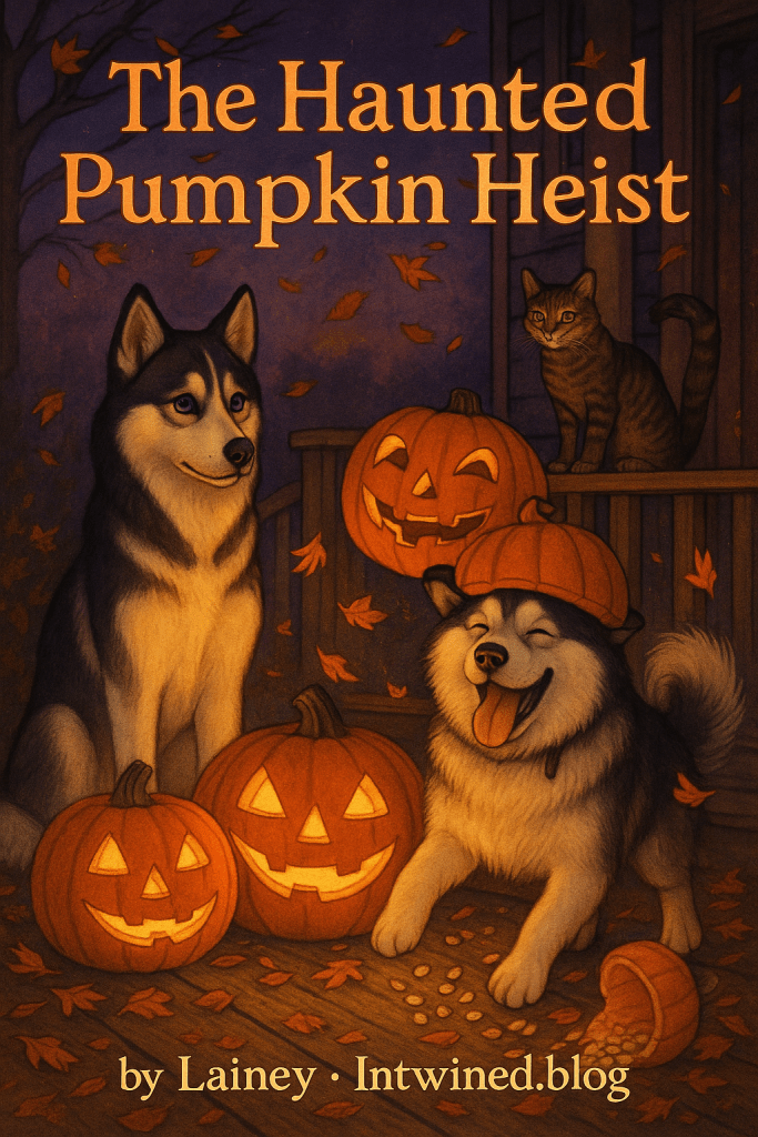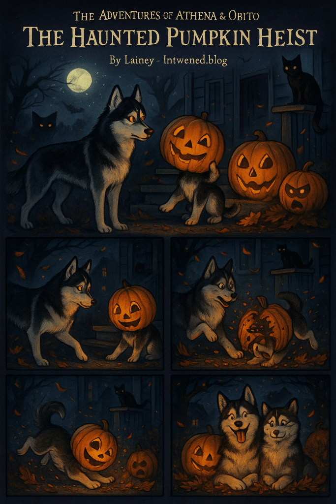 The porch pumpkins had always been… suspicious. Athena knew this. They glowed ominously in the soft autumn sunlight, casting long, menacing shadows across the steps. The tiniest whisper of wind made them wobble ever so slightly, and Athena’s chocolate eye narrowed. Something about them screamed trouble. And if there was trouble, Athena would investigate, with elegance, precision, and poise. Obito, on the other hand, saw “pumpkin” and immediately translated it into “fun, snack, wearable hat, and maybe chew toy all at once.” His enthusiasm had reached near-vibrational levels. He skidded across the porch with the subtlety of a runaway freight train, tail thrashing like a furry metronome, and before anyone could blink, he had somehow shoved his head into the smallest pumpkin. It wobbled, slipped down over his ears, and suddenly Obito was prancing around like a tiny orange knight in full battle regalia. Athena blinked once, her regal composure momentarily shattered. Munchkin, who had been perched on the railing like the eternal arbiter of all chaos, flicked his tail slowly, unimpressed. His golden eyes were narrowed, his gaze piercing: “You’ve gone completely insane. This is your life now.” He did not intervene, because one does not interfere with an enthusiastic snowdog’s pumpkin heist. That would be cruel. Athena approached the first pumpkin. She sniffed delicately, her paws landing softly on the porch floor as if she were walking a tightrope over molten lava. She circled it, twirled elegantly around the second, and finally, with a graceful flick of her tail, nudged the third one, sending it rocking slightly. Obito interpreted this subtle nudge as the start of the “Pumpkin Parade,” launching himself into a series of acrobatic jumps, spins, and slides across the porch. Each leap was accompanied by pumpkin wobble, pumpkin hat tilt, and leaves flying in all directions. Athena sighed. The first disaster struck when Obito’s pumpkin hat slipped too far forward. He tripped over the porch step, slid across a patch of leaves, and collided with Athena mid-investigation. There was a brief, chaotic whirl of fur, leaves, and orange pumpkin, after which Athena ended up elegantly curled around the pumpkin, Obito sprawled on top of her, and a third pumpkin teetering dangerously near the railing. Athena’s opal-blue eye glimmered with exasperated affection. She gently nudged Obito off, only to watch him leap back at the pumpkins with renewed vigor. Then came the Seed Avalanche. One particularly ambitious pumpkin, dislodged by Obito’s tail, began rolling down the porch steps. Seeds scattered like confetti at a deranged festival. Obito launched himself after them, sliding on the leaves with dramatic flair. Each pounce sent him sliding farther than intended, once, he pirouetted midair, landed face-first in a puddle, and somehow emerged with a seed clamped triumphantly between his teeth. Athena rolled her eyes, patted him gently with a paw, and then carefully nudged the runaway pumpkin back into place. The humans, hearing the commotion, appeared at the sliding glass door just in time to witness a sight that could only be described as pumpkin carnage meets circus disaster. Obito, tail wagging, was slipping across the yard, pumpkin hat wobbling dangerously, seeds flying in every direction. Athena, elegant and composed despite her leaf-dusted fur, was leaping gracefully over rogue pumpkins like a tiny autumnal ballerina. Munchkin, finally deciding the situation warranted his direct involvement, leapt off the railing, landed on Obito’s back for a second (with a tail flick that seemed to say “I’m doing this for discipline”), and then sprang onto the porch roof, surveying the chaos below with utter superiority. The seed chase escalated. Obito flung himself across the yard after a particularly fast seed. He skidded into the garden gnome, bounced off a flower pot, pirouetted over a pile of leaves, and emerged triumphantly, tongue lolling, pumpkin hat askew, completely oblivious to Athena’s careful, precise work in resetting the remaining pumpkins. Athena’s gentle nudges replaced what Obito had violently overturned, seeds carefully pressed back into the soil. Even in the midst of chaos, she could not resist being kind, ensuring that every pumpkin was righted, every leaf smoothed. At some point, the yard had been entirely transformed. Leaves covered in mud, pumpkins slightly dented, seeds everywhere, and Obito rolling in a pile of leaves that had once been an orderly flower bed. Athena sat on the porch steps, tail curled elegantly around her, and nudged a toppled pumpkin into perfect position. Obito bounded over, slapping her gently with his muddy paw, tail wagging so fast it created mini-wind gusts. Athena gave him a gentle nuzzle. Tears threatened to form in her eyes, not of sadness, but of overwhelming affection. Her little derpy brother, her chaos incarnate, had turned a simple porch pumpkin inspection into a full-scale autumn adventure. Munchkin finally intervened, leaping down from the roof with a graceful, disdainful flick of his tail. He batted one rogue pumpkin seed into the air, landing on the railing again like an undefeated Olympic champion. Athena and Obito watched him in silent awe for a brief moment before Obito, seeing a new “treasure” (a pumpkin stem), launched himself forward in another chaotic dive, sending Athena tumbling into the leaf pile. By the time the humans finally came outside, the porch looked like a warzone, pumpkins slightly dented, leaves everywhere, a few seeds lodged in corners of the decking, and two huskies sitting proudly atop a pumpkin-covered leaf pile. Athena and Obito’s fur was dusted with mud and leaves, and Obito’s pumpkin hat had collapsed entirely, but he looked like a tiny, ecstatic orange-and-black monster. Athena’s eyes glimmered softly as she leaned against him, and Munchkin, perched high on the railing, flicked his tail i