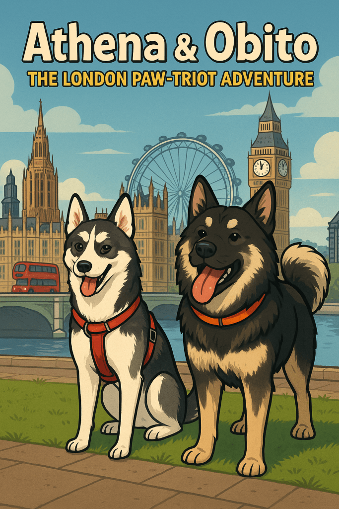 Athena, the elegant, intelligent, soft-hearted, and stubbornly regal grey, black and white husky with one opal-blue eye and one rich chocolate eye, stood on the threshold of the apartment like a queen about to survey her kingdom. Behind her bounced Obito, her one-year-old malamute brother, who looked like a fuzzy black, grey, and tan dirigible with legs, oversized paws flopping every which way. He had the eternal grin of a dog who knew he was the cutest thing alive, which, of course, he was, and a muzzle perpetually shiny from drool and his ever-present quest for snacks. Today was not just any day, it was a grand adventure in London, which Athena, ever the discerning canine aristocrat, had decreed must be “properly dignified, yet firmly assertive in its demand for treats and snuggles.” Obito, of course, misinterpreted this entirely as “bounce on everything, lick all humans, and cause chaos wherever possible.” Their first hurdle was the cab ride. Athena pranced elegantly into the backseat, folding her legs neatly as though she were settling into a royal carriage. Obito, however, decided that climbing over Athena’s carefully arranged legs was far too slow. Instead, he attempted a full vertical jump from the floor to the top of the seat, misjudged his trajectory, and ended up sprawled across the dashboard, tail wagging like a windshield wiper. Athena shot him a look that could melt stone, or at least melt a human’s soul, but Obito just grinned and flopped over again, shaking the cab like a tiny furry earthquake. Once they reached London, the city truly became their playground. Athena walked with the poise of someone attending a gala at Buckingham Palace, ears erect, tail high, one paw delicately avoiding puddles. Meanwhile, Obito ran in random directions, sniffing every lamppost, chasing pigeons that were way too fast for him, and leaving muddy pawprints on every sidewalk tourist could see. A street performer tried to play the accordion; Athena ignored him with aristocratic disdain, but Obito tackled the accordionist, thinking the instrument might contain treats. The crowd gasped, laughed, and scattered as the accordion emitted a sound somewhere between a wail and a death rattle. The first stop on their “March for Treats, Snuggles, and Lawn Preservation” was Trafalgar Square. Athena raised a single, graceful paw as if addressing a parliament of squirrels. She barked once, a short, precise command: “All humans must provide treats, blankets must be acknowledged as sovereign territories, and all pigeons shall be monitored for suspicious activity.” Obito, interpreting this as a personal challenge, immediately rolled onto his back and began spinning in circles so fast he created a small wind vortex, sending a rogue hot dog cart skidding sideways and scattering pretzels everywhere. Athena’s tail flicked in disbelief, while a small child named Timothy declared Obito “the funniest dog in all of London” before attempting to join in the spinning, promptly falling over. From there, the siblings proceeded to a garden near the Thames. Athena, ever the gardener at heart, delicately sniffed and then dug up flowers, not destructively, of course, but with artistic precision. “A little redecoration never hurt anyone,” she mused. Obito, on the other hand, went full-on excavation mode. He dove face-first into the soil, emerging minutes later wearing an entire flowerpot on his head like a crown. Athena blinked. One opal, one chocolate. “We are related, and yet I have no words.” Things escalated at Buckingham Palace Gardens. Athena spotted a bench she deemed worthy of her royal presence and leapt elegantly over it, a flawless landing. Obito attempted the same jump, miscalculated, and crashed into a bush, emerging with several leaves stuck in his fur and one particularly unimpressed squirrel clinging to his tail. Athena sighed, touched his head with her paw, and muttered, “You are impossible… yet somehow adorable.” Obito responded with a grin so wide it seemed to split his face, tongue lolling, mud dripping proof that happiness comes in giant, slobbery packages. Next came the highlight of their “protest”: demanding treat equality at street vendors. Athena approached a hot dog stand with the elegance of a diplomat. She accepted a single biscuit with dignity, savoring it like a fine wine. Obito, sensing an opportunity, dove headfirst into the pile of discarded napkins and crumbs, emerging with a pretzel on his nose and a triumphant look. A nearby corgi applauded. Athena rolled her eyes so hard it was a miracle she didn’t dislocate something. The climax, of course, was the fountain incident. Athena, atop a low wall, surveyed the scene like a general. Obito, interpreting this as “time for maximum chaos,” launched himself into the fountain with a splash worthy of a small tidal wave. Athena, perfectly poised, attempted to leap after him, but the fountain’s slippery edge had other plans. She slipped midair, executed what could only be described as a “graceful mid-flight pirouette,” and landed, somehow, on Obito, who was now flailing in the water. Together, they created a scene that tourists would describe for years: a grey-and-white husky on top of a massive, derpy malamute, both soaked, both triumphant, surrounded by floating pretzels and a very wet pigeon. Exhausted but victorious, the pair finally collapsed on a massive blanket Athena had carried, because yes, even in the chaos of London, Athena always had her priorities straight. Obito flopped against her, spreading mud, drool, and love in equal measure. Athena’s paw rested gently on his side, and she muttered, “You are insufferable. You are exhausting. You are… mine.” Obito responded with a wet kiss to her opal eye and a snore so loud it scared a nearby squirrel into early retirement. London had been conquered. Treats had been liberated. Gardens had been re-landscaped. And two dogs, one elegant, intell