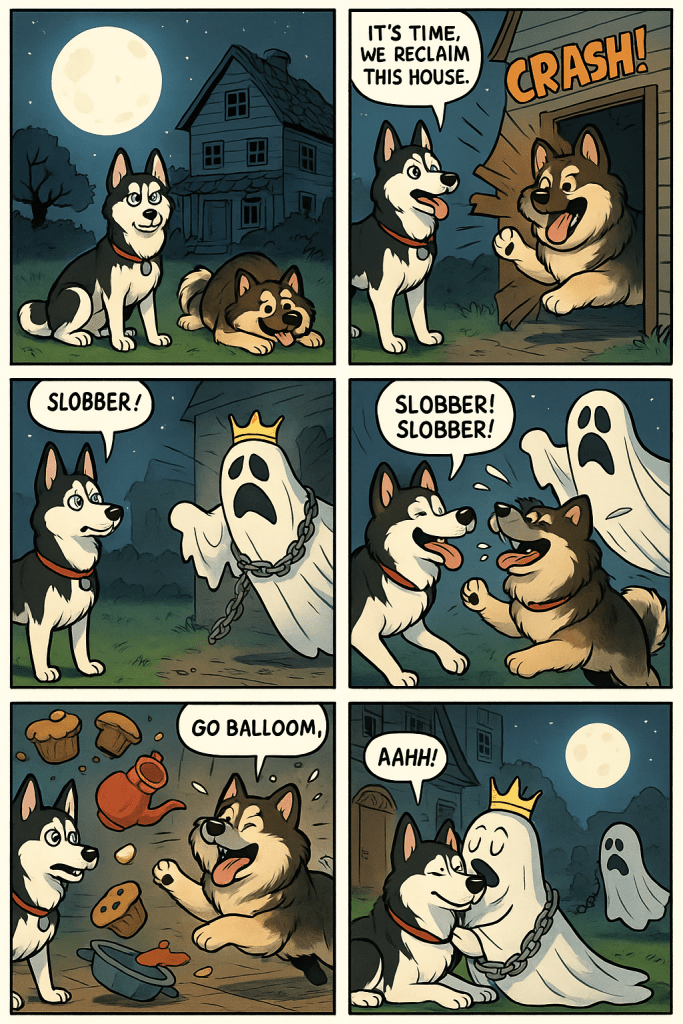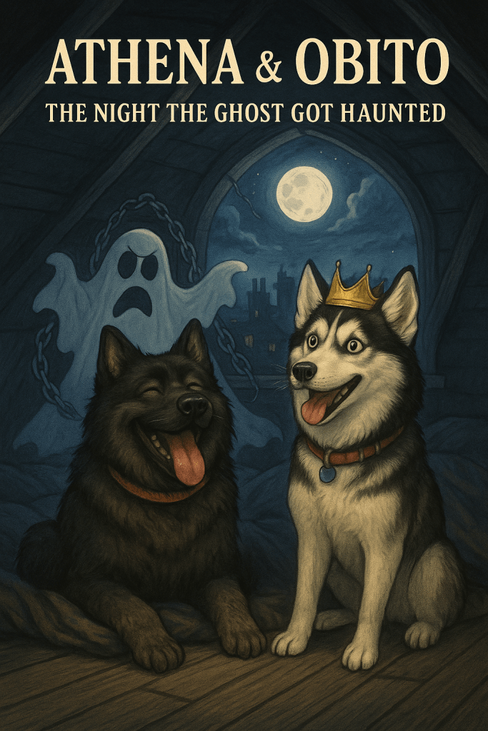 The moon was full, massive, and slightly judgmental, casting a silvery glow across the infamous haunted house at the end of the street. Its windows stared blankly like the eyes of the long-dead nobles whose portraits lined the walls inside. Children dared not walk by, adults crossed the street, and cats… well, the cats had already run away. Athena, poised as a queen, stood on the lawn, fur sleek, tail flicking with precision, eyes gleaming, one opal, one warm chocolate, each reflecting the night like twin stars. Obito, her oversized, derpy, affectionate brother, rolled in the dew-soaked grass, scattering it like glittering confetti. Leaves, dirt, and Athena’s dignity flew everywhere. “It’s time,” Athena announced in a voice only a husky of perfect breeding and intelligence could muster. “We reclaim this house. The ghost is… lacking proper supervision.” Obito barked. Translation: “I will slobber all over this ghost and eat everything I see!” The front door loomed ominously. Athena approached with elegance, each pawstep a study in controlled grace. Obito, interpreting elegance as a challenge to physics, launched himself at the door with the velocity of a small horse on rocket fuel. CRASH! The door swung open, cobwebs exploded, fake spiders flew, and Athena twirled midair to avoid an incoming sticky trap. Obito flopped into the hallway, smearing webs across the walls, leaving a trail that looked suspiciously like modern art. The ghost appeared: tall, wailing, chains rattling, and sheets floating like angry laundry. Its face contorted in terror… at first. Athena blinked. Obito yipped and hurled himself at the ghost. Wet kisses. Mud pawprints. A tail-wag hurricane. The ghost screamed a banshee-squeaky-toy hybrid noise. Athena elegantly swiped its floating crown mid-air. Obito, tangled in the ghost’s chains, rolled it like a furry pinball. The ghost’s sheet flapped wildly as it shrieked: “THE LIVING… THEY ARE… TOO MUCH!” Athena led Obito to the kitchen. Ghostly muffins floated in midair. Ghostly teapots spun like top hats. Athena delicately sniffed at a floating sandwich. Obito, seeing potential snacks and chaos, barreled in, sending muffins flying, knocking a teapot into a spectral loaf of bread that exploded in midair. Athena elegantly leapt onto the counter, tail flicking with judgment. Obito flopped into the pantry, tumbling through jars of ghostly pickles. A spectral fireball, small, harmless, but dramatic, erupted, bouncing off the ceiling. Athena sidestepped, looking like a queen dodging peasants’ insults. Obito yipped with joy, sliding across the floor in a mixture of ectoplasm, water, and mud. The ghost tried to look terrifying. Obito tackled it. Athena, unimpressed, stole the crown again. The ghost shrieked: “I… I… I CAN’T HAUNT! THEY’RE TOO… FUZZY!” The grand ballroom awaited. Chandeliers swayed dangerously. Ancient portraits scowled. Athena landed elegantly on the marble floor, crown perched like a jewel of justice. Obito, on the other hand, spun across the room like a derpy cyclone, colliding with a suit of armor, which triggered a catastrophic domino effect: vases fell, furniture toppled, and one grand piano somehow slid five feet. The ghost, desperate, tried its most menacing chains-and-wail attack yet. Athena elegantly flipped over it. Obito grabbed a chain in his oversized paws, started a tug-of-war. The chandelier wobbled. Athena leapt atop it, spinning like a furry ballerina. The ghost, dangling upside down, screamed: “MY HAUNTING… MY POWER… MY DIGNITY… GONE!” The staircase loomed. Athena descended each step like poetry in motion. Obito bounced three at a time, knocking over a candelabra, which triggered a tiny spectral firework display. Athena sidestepped with a tail flick. Obito, meanwhile, attempted to “rescue” the ghost by tackling it into a fountain, sending water and ectoplasm spraying everywhere. The ghost tried to float menacingly over them, but Obito intercepted, rolling the ghost like a furry doughnut. Athena elegantly retrieved the crown again and perched atop a banister. The ghost squealed: “WHY… ARE YOU ALIVE?!” At last, the attic revealed a trapdoor. Athena landed like a snow leopard. Obito barreled through, bouncing like a furry cannonball. They collided, rolled, and tangled in blankets Athena had dragged up for nap time. The crown remained slightly askew atop Athena’s head. Below, London sprawled in moonlight. Athena sniffed the night air, imperious and elegant. Obito flopped atop her, toe beans twitching, utterly content. The ghost, cornered, chains tangled, was done. In its final attempt at terror, it tried to vanish. Obito barked. Athena nudged the crown against its ethereal forehead. The ghost screamed, then ran screaming into the night, vowing never to haunt anything ever again. Athena, satisfied, curled elegantly around Obito. Obito’s tongue lolled. Together, they slept, victorious atop the roof, blankets fluffed, mud and ectoplasm glistening under the moonlight. The haunted house had been utterly haunted… by the living. Children still whisper: “Beware Athena & Obito. They will ruin your ghosts, steal your crowns, and give you wet kisses that terrify the afterlife.” Even the moon seemed to wink, acknowledging that one night, two dogs had defeated a ghost in every way possible… and made the whole thing hilarious.