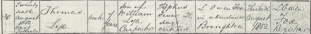 L. Owen Fox, the registrar from Broughton, was once again there, in the quiet moments of Thomas’s final days, witnessing the agony of a mother losing another child to the grip of disease. On the 30th day of August, 1852, just days after Thomas’s passing, Registrar Fox registered his death, recording the grim details with somber precision. He wrote, “7-year-old Thomas Lye, son of William Lye, a carpenter, died after 28 days of being gravely ill with Typhus Fever on 26th August 1852 in East Tytherley. His death was certified.”