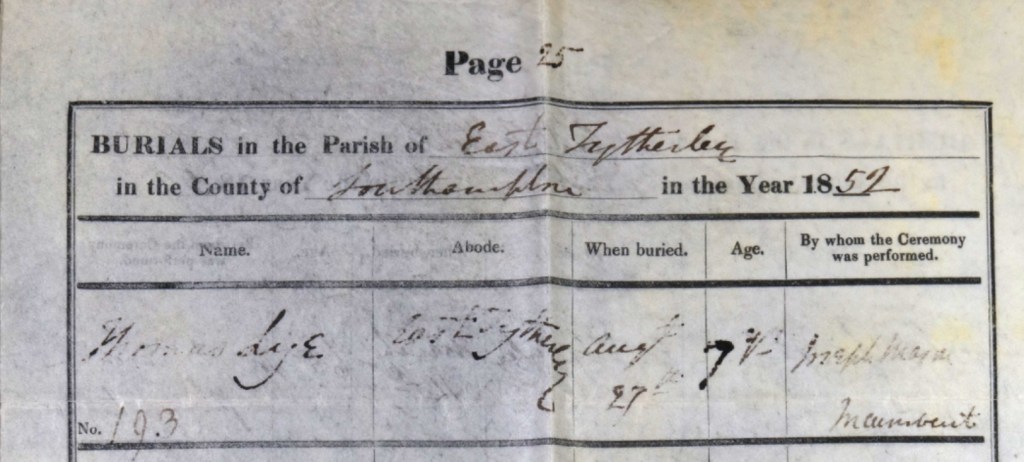 The burial, performed by Incumbent Joseph Mason, was a somber occasion. The parish churchyard, surrounded by the quiet countryside, became the final resting place for a child whose life had been full of promise but was taken too soon. Joseph Mason logged the details of Harry’s burial in the register, recording, “3 and 3/4-year-old Harry Lye of East Tytherley was buried on August 11th, 1852, in the parish of East Tytherley in the county of Southampton.”