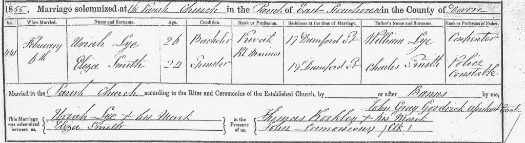 The register entry reads, "On the 6th February 1855, at the parish church of East Stonehouse in the county of Devon, 26-year-old bachelor Uriah Lye, a private in the Royal Marines, of 19 Dunford Street, son of William Lye, a carpenter, married 24-year-old spinster Eliza Smith, of 19 Dunford Street, daughter of Charles Smith, a Police Constable." Their witnesses were Thomas Rookley and John (surname unclear), and both Uriah and Thomas signed the document with their marks, an "X," a quiet reflection of their lack of formal education in a time when literacy was not universal.