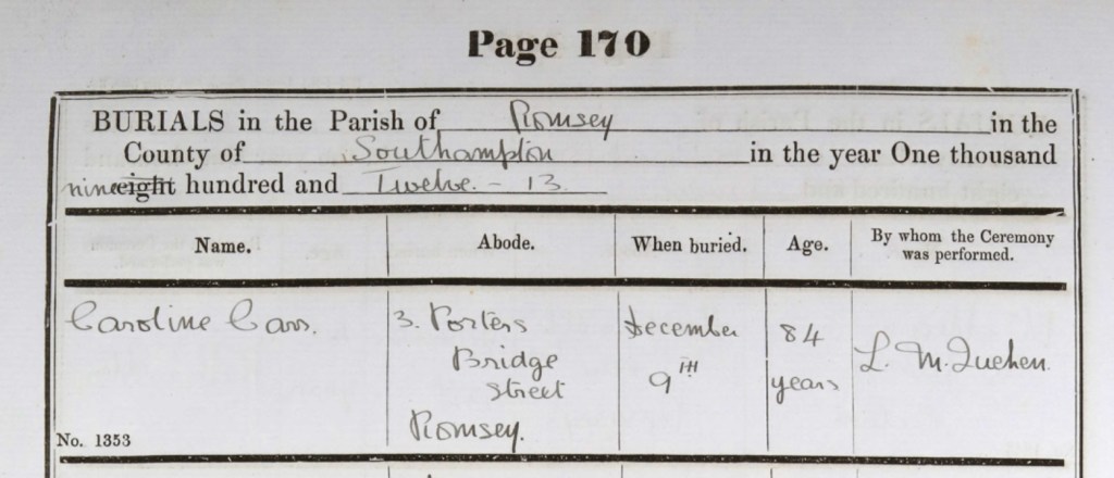 Registrar Henry H. Saxby recorded Caroline’s details in the death register, marking the passing of a woman who had lived a long and full life. The entry read, “84-year-old Caroline Carr, widow of Henry Carr, a sawyer, died on the 5th of December 1912, at Number 3, Portersbridge Street, Romsey, of senile decay.”Caroline’s death was certified by F. W. Maus, M.R.C.S.