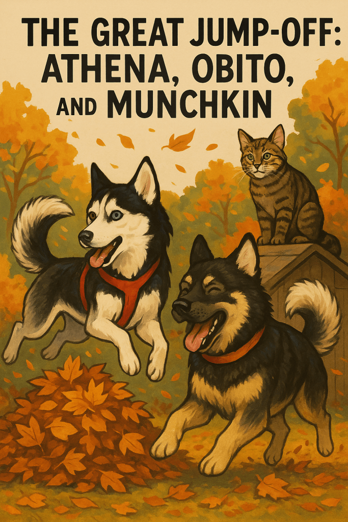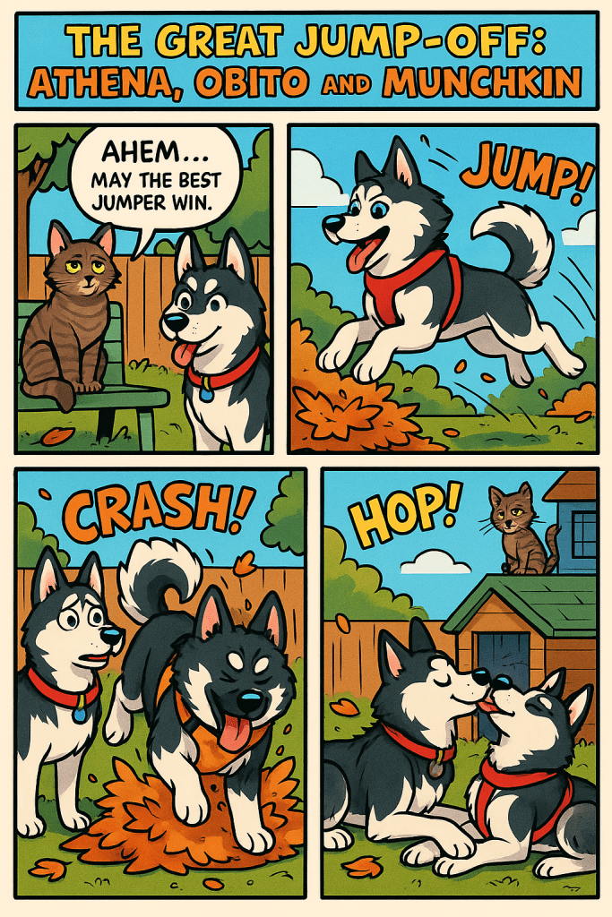It all began on a crisp autumn morning, when the sun painted the garden in golden light and the air smelled faintly of leaves and mud. Athena stretched elegantly atop the sofa, her opal-blue eye sparkling with determination, her chocolate eye calculating the perfect course for maximum dramatic elegance. Obito, meanwhile, had already dug a trench in the soft earth, rolled in it, and attempted what could only be described as a pre-jump warm-up dance involving at least three somersaults, a tail spin, and one accidental face-plant into a leaf pile. Munchkin, perched atop the garden bench like a furry referee in a velvet robe, watched with what could only be described as aristocratic disdain. His tail flicked once, the universal cat signal for “I see you’re all idiots”. “Gentlemen… and, uh… lady,” Munchkin said in his mind (cats don’t speak, but Athena and Obito understood), “may the best jumper win. And no cheating. I am watching.” Athena’s first jump was a masterclass in husky athleticism. She crouched, muscles coiled, tail flicking like a metronome set to graceful elegance. She launched herself into the air, soaring over the garden bench, over a strategically placed leaf pile, and because she was Athena, landed perfectly on the other side, paws delicate but firm, leaves drifting around her like a golden halo. Obito’s first attempt… well… it was enthusiastic. He crouched, tail wagging so violently it almost created lift, and leapt. For a moment, it looked like he might actually make it. Then physics intervened. Obito’s hind legs veered left, his front legs veered right, and his ears flapped like twin flags in a hurricane. He collided mid-air with a particularly judgmental pile of leaves, rolled three times, and landed nose-first in Athena’s mud puddle from last week. He emerged blinking, ears bent, and tail wagging, looking like a small, muddy, ecstatic dragon. Athena sniffed delicately. Munchkin facepalmed. The second round was Munchkin’s turn. He stretched like a tightrope artist, claws extending for balance, and leapt from the garden bench. He sailed over Athena, over Obito, and, because cats are dramatic, paused midair for an extra half-second to gaze at his audience with pure superiority. Then he landed. On the neighbor’s fence. With a flick of his tail. And a single, disdainful glance back at Athena and Obito. “Amateurs,” he muttered under his breath, which only Obito interpreted as a challenge. Round three was chaos. Athena, feeling the thrill of competition, executed her patented “flip-over-leaf-pile-while-looking-casually-regal” maneuver. She landed perfectly, of course, and gave Obito a look that said, “Are you even trying?” Obito… well. Obito tried. He ran at full speed, took a running jump over a pillow, collided with a small bush, ricocheted off the garden hose, and landed, somehow, on Athena’s tail. Athena yelped, spun, and landed in a patch of mud, leaving Obito pinned on top of her like a gleeful, furry pancake. Leaves flew, tail thwacks echoed through the garden, and Munchkin hissed like a tiny, judgmental steam engine. Tear-jerkingly, Athena paused mid-roll, nudged Obito gently with her nose, and whispered, “It’s okay, you’re my little derpy brother. You win in spirit.” Obito responded by licking her face with his slobberiest, most enthusiastic kiss, leaving both of them muddy, leaf-strewn, and perfectly chaotic. Munchkin, clearly feeling the need to assert dominance, performed his ultimate jump, a sleek, clean, gravity-defying curve from the garden bench to the highest point of the shed. He landed like a furry statue of victory, tail flicking once in elegant triumph, ears tilted slightly back in judgment, and eyes gleaming with a “this is why I am superior” glare. Athena and Obito looked up at him in awe. Obito immediately attempted to replicate the jump, forgetting that he was about a foot taller than Athena now, and a lot less coordinated, and ended up landing in the compost heap, completely obscured by leaves, mud, and possibly a startled worm. The final round was a free-for-all. Athena performed a triple-spin leap over the garden hose and into a leaf pile, Obito attempted a running cannonball that somehow ended with him wrapped around a tree trunk, and Munchkin… Munchkin, with a single bound, leapt gracefully onto Athena’s back, surveyed Obito’s disaster, and then leapt onto the roof of the shed, tail high, silently daring them to try again. In the end, there were no winners. Or maybe everyone was a winner. Athena had her elegance, Obito had his joyous chaos, and Munchkin… well, Munchkin had the satisfaction of watching everyone else flail while he remained the undisputed master of all things jumpable. Athena and Obito collapsed in the leaf pile, breathless and muddy, laughing (or snow-dogs-snarling) through leaf-dusted snorts. Obito smothered Athena in slobbery kisses, tail wagging furiously, while Athena purred her approval. Munchkin, from the shed roof, flicked a single paw downward in a regal wave, as if to say, “You may have tried, peasants, but I am eternal.” And as the sun dipped lower, painting the garden gold, leaves scattered, tails wagged, and a cat purred with victory, it was clear, jumping competitions might not have winners, but they definitely had laughter, love, and belly-hurting chaos.