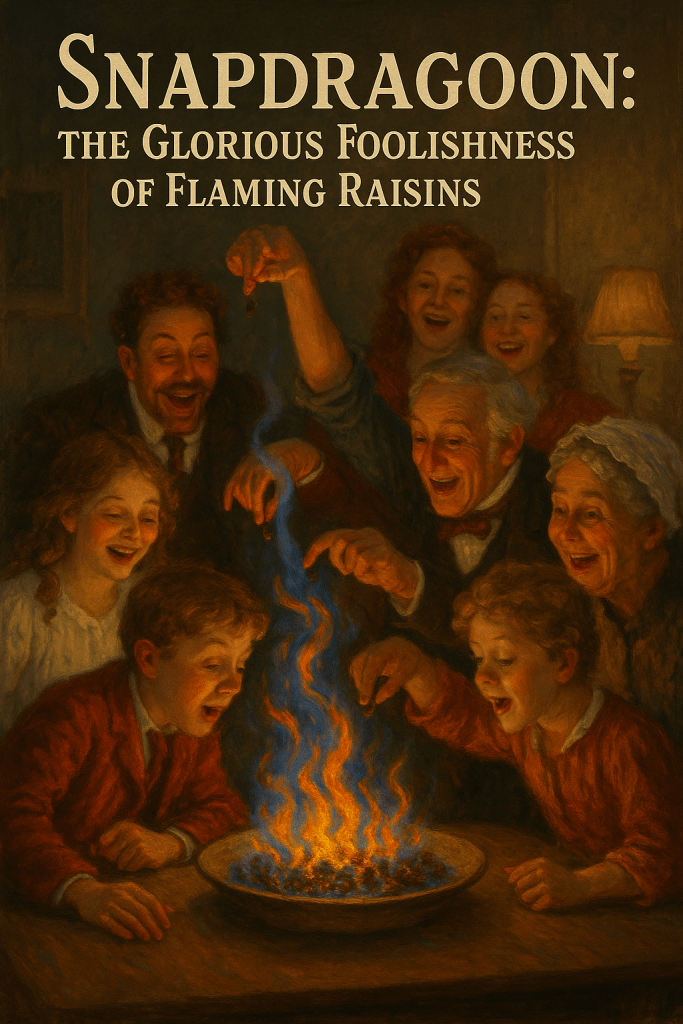 Snapdragon: The Glorious Foolishness of Flaming Raisins When a modern household descends into chaos over a misplaced pawn or a disputed rule in a board game, there is oddly enough, some comfort in remembering that at least no one is setting fire to the refreshments. The Victorians, however, possessed a brand of festive fortitude entirely their own. Their hearts were braver, their amusements bolder, and their sense of self-preservation significantly more negotiable. For them, Christmas entertainment was not complete without the crackling thrill of Snapdragon, a game so wonderfully absurd that only the nineteenth century could have embraced it with such affection. Picture it: a wide, shallow dish placed ceremoniously at the center of the parlour table, heaped generously with raisins and then drowned quite unashamedly, in brandy. The lamps dim. The room hushes. The curtains shiver as if even the draught were holding its breath. And then, with the calm assurance of a people whose clothing was made almost entirely of flammable fibres, someone strikes a match. A brief pause. A flicker. A whisper of sulfur. And then the brandy ignites in a ribbon of shimmering blue, curling upwards like a spell cast by a mischievous winter sprite. The flames dance and twist, casting enchanted shadows on the wallpaper roses. Laughter erupts. Guests lean forward eagerly, warmed by firelight and mulled wine, the air rich with the sweet, smoky perfume of burning spirits. And into this reckless glow they thrust their hands, bare hands! to snatch a sizzling raisin from the swirling flames before tossing it triumphantly into their mouths. Children joined with the same delight as their elders, their cheeks rosy with excitement, their eyes reflecting both the blaze and their own daring. It was festive. It was foolish. It was utterly adored. And it had its own soundtrack, playful rhymes murmured or chanted to the rhythm of the flames, verses that cautioned players to be nimble or risk losing more than their raisin. Some families recited them with solemn mock-gravity, others with raucous amusement. The game appeared in parlours across Britain, from grand country estates to modest townhouses, and was even mentioned in guidebooks of the time as a recommended Christmas amusement, as though it were entirely reasonable to set one’s dessert aflame and then dive into it. But as the decades unfurled and safety grew more fashionable than spectacle, Snapdragon’s firelit bravado quietly slipped into history. Modern sensibilities, less tolerant of scorched tablecloths and blistered fingertips, coaxed it gently out the door. What remains is its memory: a faint whiff of singed sugar, a shimmer of blue flame in the mind’s eye, a whisper of laughter rising from a Victorian parlour where danger and delight danced hand in hand. And oh, what a magnificent, ridiculous dance it was.