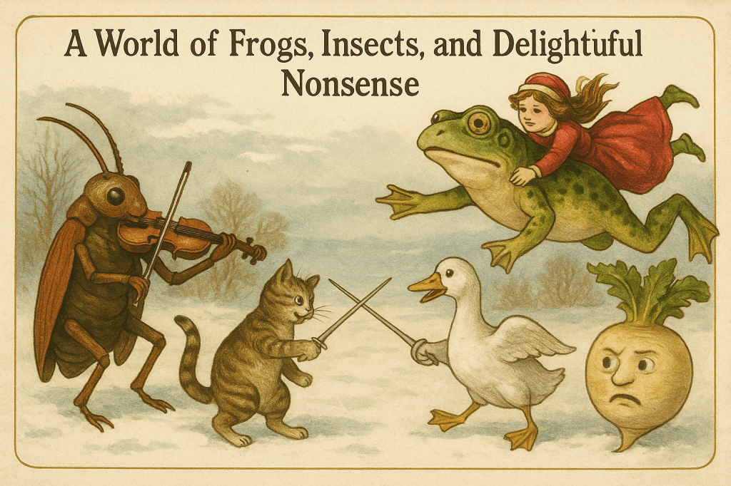 A World of Frogs, Insects, and Delightful Nonsense. Of all the eccentric marvels the Victorians offered the world, none is quite as endearing or delightfully baffling, as their unshakable devotion to nonsense. They embraced absurdity with the same enthusiasm they applied to lace trimmings, intricate etiquette, and elaborate puddings. And nowhere did this whimsical spirit unfurl more extravagantly than in their Christmas cards. To the modern eye, these cards look as though they’ve tumbled out of a dream dreamt by someone who had eaten far too much plum pudding and perhaps inhaled a little too much lamp oil. Yet to the Victorians, they were simply charming expressions of holiday cheer. Their festive illustrations seemed to exist in a parallel universe where logic wore a paper crown, poured itself a glass of punch, and promptly wandered off. Here, giant insects played the violin with enviable confidence, their delicate wings shimmering as they performed serenades upon snowy stages. Cats, their whiskers bristling with bravado, challenged geese to duels, both combatants wielding tiny swords with grave determination. Turnips gazed out from the artwork with faces carved into expressions of mild concern or gentle surprise, as though contemplating the mysteries of vegetable existence. And children, those small apprentices of imagination, flew across the sky on the backs of improbable creatures, moths, fish, owls large enough to carry them toward stars shaped suspiciously like sugar. Such imagery might seem bizarre to us, but in the Victorian era it made perfect, poetic sense. These were people living in the iron grip of industry, monotony, and meticulously structured social codes. Whimsy was not merely entertainment; it was a rebellion, a pocket-sized revolt wrapped neatly in an envelope. It allowed the imagination to stretch its limbs, to leap elegantly over the constraints of propriety and decorum. Victorian Christmas cards were miniature windows into enchanted worlds, wide open for anyone willing to peer in. They were invitations to wander through snowy forests where beetles wore boots, where frogs in waistcoats danced beneath lantern-lit branches, where time slipped sideways and delight was the only compass. This devotion to nonsense did not undermine their Christmas spirit, it adorned it. For the Victorians believed with unshakable conviction that the world was far more interesting when you allowed it to be absurd. Their yuletide fantasies overflowed with magic and symbolism, unafraid to blur the line between reality and wonder. In their cards, as in their hearts, imagination was not something to be restrained. It was something to be celebrated, cherished, and sent through the post with a cheerful message and a flourish of ink.