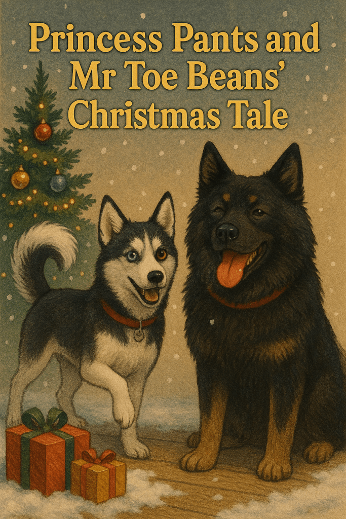 Two pups, one Christmas story, filled with laughter, love, and play, A Princess and her Love Bug making magic every day. And as they dreamed of snowflakes, treats, and fields where they could roam, Their humans smiled and whispered, “Merry Christmas, furry family welcome home.”