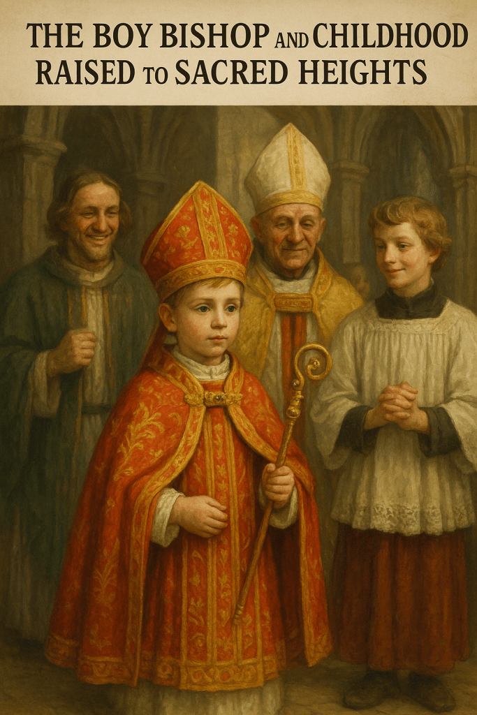 The Boy Bishop and Childhood Raised to Sacred Heights. Among all the marvels that shimmered through the medieval winter, none glowed with quite the same tender enchantment as the election of the Boy Bishop. While snow hushed the world and candlelight trembled like captive stars within cathedral walls, the Feast of Saint Nicholas arrived with its soft, expectant magic. From the ranks of choirboys, one small figure was chosen, lifted for a brief, luminous span into the lofty role of bishop. His companions looked on with a mixture of pride and astonished delight, as though one of their own had suddenly sprouted wings. Robes of ecclesiastical splendor, heavy with embroidery and history, were draped over shoulders still narrow from childhood. The great mitre, often slipping sideways, sat like an enchanted crown upon his brow. Into his hands was placed a tiny crozier, carved to match the grandeur of the real one but sized like a wand from a fairy tale. Thus dressed, he stood transformed: no longer merely a child, but a symbol of innocence raised to sacred heights, walking the thin silver line between play and genuine holiness. He led processions through echoing naves, his steps small yet steady, his face composed with an earnestness that touched even the most stony-hearted parishioner. Bells chimed gently above him, as though adjusting their voices to suit his small stride. The congregation followed, their smiles tucked discreetly at the corners of their mouths, not in mockery but in admiration. For in those brief days, the world turned toward youth with a reverence rarely afforded it, and even the stern pillars of the Church softened their shadows. The boy delivered sermons crafted with the help of adults, yet spoken in his own clear, high voice. And somehow, in that fragile tone, the words grew softer and brighter than they would have sounded from any adult bishop. His messages were hopeful, tender, laced with a simplicity that felt like truth distilled. He reminded his listeners of charity, of kindness, of the small mercies that knit a community together more securely than any law or edict. In some places, he undertook ceremonial duties: blessing parishioners, visiting the sick, offering prayers for the poor. People listened with the kind of attention one might give to a miracle, for there was something profoundly moving about being guided, even briefly, by someone not yet acquainted with cynicism. In England and parts of continental Europe, the Boy Bishop’s reign could last until Holy Innocents’ Day, a span of time that stitched together celebration and remembrance. During those days his authority, though symbolic, was recognized. He rode at the head of festive processions, distributed small gifts, and was treated with the respectful formality due a spiritual leader. The real bishop stepped aside with grace, understanding that this ritual inversion was not frivolity but a deeply rooted affirmation of the sacredness of youth. This gentle tradition whispered an important truth into the medieval ear: that wonder deserved a place beside wisdom, that childhood held its own kind of holiness, and that the voice of a child might sometimes speak more tenderly to the human spirit than the voice of a king or cleric. In an age often remembered for its hardships and stern pieties, the Boy Bishop stood as a radiant exception, a bright flame cupped carefully against the winter wind. And when the short reign came to its close, when the robes were returned, the mitre set back upon its accustomed shelf, and the crozier handed again to its rightful owner, the memory lingered. It lived on in the hearts of villagers and clergy alike, a reminder that within even the most ancient traditions lies room for play, for imagination, and for the belief that sanctity sometimes chooses the smallest hands to carry its light.