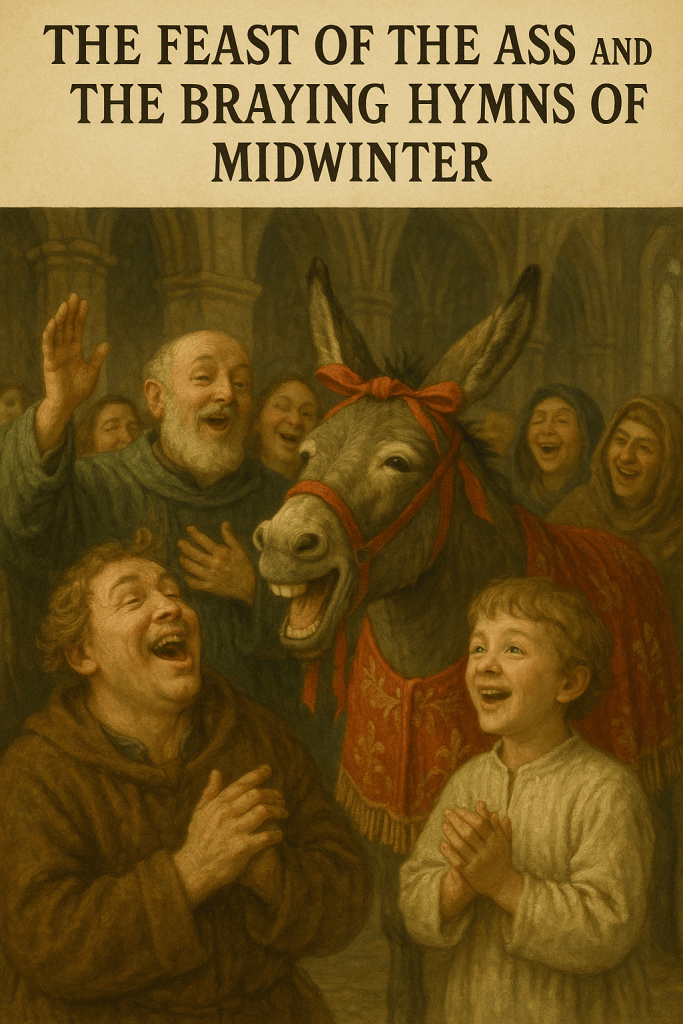 The Feast of the Ass and the Braying Hymns of Midwinter. Amid the tapestry of medieval winter rites, woven with threads of solemnity and star-lit wonder, there existed a celebration as endearing as it was uproarious: the Feast of the Ass. It was a festival that dared to lift its voice not in lofty harmonies, but in the warm, unpolished music of barnyard humility. While some feasts crowned mock kings and others elevated children to sacred thrones, this one turned its gaze toward a creature whose quiet patience had earned a place in the softest corners of the nativity tale, the humble donkey. Rooted in the reverence for biblical stories, particularly the Flight into Egypt, the festival honored the steadfast beast who carried the Holy Family away from danger. In certain regions of France, where the tradition flourished most vividly, a real donkey was led into the church itself on the appointed day. Draped in ribbons, woven garlands, or embroidered cloth, the creature trotted solemnly down the nave, its hooves striking sparks of surprise and delight from the assembled congregation. Some accounts speak of the animal being guided all the way to the choir, where it stood with a dignity that rivaled the stone saints overhead. The Mass that followed was no ordinary service. It shimmered at the edges with the delightful absurdity that winter seems always eager to allow. At moments where the priest expected the usual responses, the congregation instead offered their loudest, most wholehearted hee-haws. These were not timid imitations but full-throated brays, echoing through the cold stone like rustic trumpets. In Beauvais, where the feast is said to have reached its most exuberant form, the priest himself concluded the service by turning toward the people and giving a hearty hee-haw three times, to which the congregation responded in kind. The entire church, for a fleeting instant, became a chorus of joyful beasts. It would be easy, at first glance, to mistake this for mockery, but those who lived in that age knew better. In a world where hardship lay close at hand and winter pressed unforgivingly at every door, the Feast of the Ass offered a rare mixture of mirth and reverence. It reminded the faithful that the great arc of sacred history depended not only on kings, angels, or miracles, but also on the modest labor of a creature whose only virtues were patience, steadiness, and the willingness to bear burdens without complaint. The braying hymns of this midwinter celebration carried a lesson wrapped in laughter. They taught that humility was not a virtue to be whispered about, but sung aloud; that holiness could be found in the lowliest stable as surely as in the grandest cathedral; that wisdom sometimes speaks through the quiet endurance of animals rather than the proclamations of the mighty. Even the cold, aloof stones of the church seemed to soften under the sound, warmed for a moment by the memory of a donkey’s gentle role in the sacred flight. When the ribbons were removed and the animal led back into the crisp winter air, the echoes of the hee-haws lingered like a smile in the rafters. And so the Feast of the Ass took its place among the season’s rituals: a reminder that the world, for all its solemnity, always has room for warmth, for laughter, and for the humble creatures who carry the weight of our stories with unassuming grace.