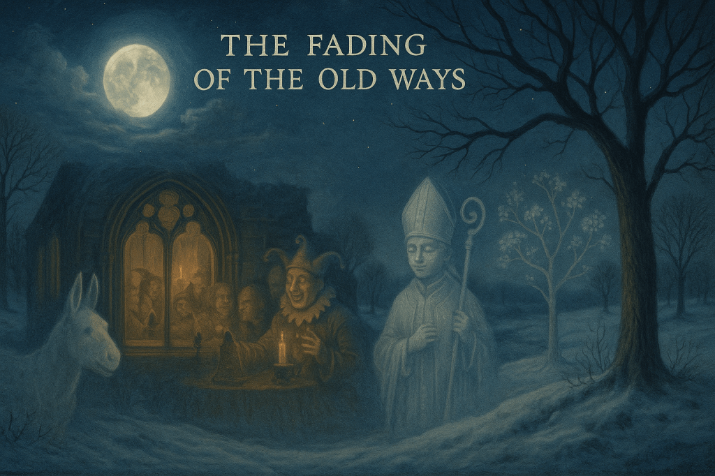 The Fading of the Old Ways. Time, that tireless traveler whose cloak is stitched with centuries, moves onward without pause, and even the most beguiling customs eventually grow drowsy along the path. The medieval world, with all its pageantry and holy mischief, entered a new age where the bright tapestry of rituals was tugged and rewoven. During the Reformation, when Europe tightened its posture and sharpened its devotion into more austere lines, many of these joyful ceremonies dimmed like candles being pinched out one by one. The lilt of comic hymns faltered, the mock kings and child bishops were ushered quietly from their brief thrones, and the donkey, once welcomed into stone naves with garlands on its sturdy back, found the church doors closed against its gentle bray. What remained was a leaner, sterner winter, its shadows less playful, its merriment more restrained. Yet not all was swept away by the winds of reform. Some customs lingered in pockets of countryside where memories cling like frost upon hedge branches. Others dissolved not from condemnation but from simple forgetfulness, like snowflakes that melt before they reach the earth. New celebrations rose in their place, shaped by shifting beliefs and changing lives, but the old ones did not vanish entirely. They slipped instead into the twilight realm of the historical imagination, where they shimmer more brightly for being half-remembered, half-dreamed. There they remain, glowing like embers at the edges of winter. These traditions remind us that Christmas was once a season in which the world allowed itself to be wild and tender in the same breath, where the sacred and the silly danced arm in arm around the Yule fire. They reveal a time when people understood that life is strengthened not only by reverence but by play, not only by solemn prayer but by laughter that lifts the heart like lantern-light in the dark. They carry with them the memory of a world that believed winter to be alive with spirits and blessings, where darkness was never empty but filled with the quiet stirrings of rebirth. And perhaps, if you slip outside on Christmas Eve when the stars hang crisp as bells and the air hums with the hush of frost, you may catch a glimmer of those ancient festivities. Listen closely to the wind threading its fingers through the branches. You might hear the faint, merry riot of fools tumbling through a candlelit hall, their revels warming the cold stone. You might hear the bray of a donkey stepping solemnly into a long-ago church, its voice rising into a joyful hymn that startles even the rafters. You might imagine a small boy clad in robes too grand for him, speaking a winter sermon with the fragile wisdom of innocence. And far off, barely more than a breath, the apple trees may whisper in their sleep, dreaming of the warm cider poured at their roots and the promise of returning spring. Though the old ways have faded, their echoes still drift through the world like snowflakes caught in moonlight, soft, fleeting, and full of wonder for those who choose to listen.