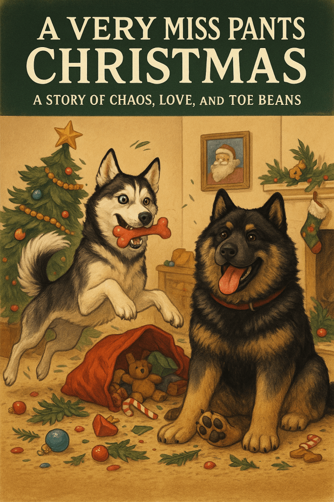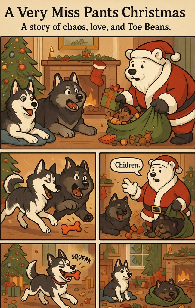 There are dogs, and then there is Athena, the elegant, intelligent, gentle, soft-hearted, two-year-old husky with the aesthetic of a snow princess and the personality of a toddler who just discovered espresso. A creature of beauty and brains who also regularly achieved flight while leaping over furniture for reasons known only to her and possibly several bored angels. She had a black, grey and white coat that looked like it was painted by a fancy artist who charged too much, and her two eyes, one opal blue, one rich chestnut, gave the constant impression that she could read minds and was deeply unimpressed by most of them. Her family adored her. Naturally, they called her Princess and Miss Pants, and it is widely believed she accepted these titles, not verbally, but by simply staring at a human until they felt compelled to bestow royal names upon her. She hated wet paws with a passion normally reserved for dramatic soap opera characters. Rain offended her. Mud insulted her ancestry. Morning dew was a personal betrayal. She crossed damp grass like a Victorian lady insisting she might faint dramatically if her delicate toes so much as touched something moist. And yet she cherished chaos. Digging up the lawn with the enthusiasm of a pirate seeking buried gold? Absolutely. Excavating flower beds until they resembled crime scenes? Yes. Nibbling noses as her preferred form of affection? Double yes and a half. Sharing her kingdom was Obito, a one-year-old malamute with the physical grace of a baby polar bear on roller skates and the soul of an overexcited cinnamon roll. He was fluffy, enormous, and in perpetual disbelief about the size of his own paws, which were large enough to qualify as flotation devices. His face was black, with tan eyebrows and eye patches that made him look permanently startled. His body was a black, tan, and grey cloud of fluff, like someone tried to draw a wolf from memory but forgot how legs worked halfway through. He was known far and wide as Mr Toe Beans and Love Bug, because his preferred love language was drowning unsuspecting humans in oceans of sloppy kisses while smiling the world’s goofiest, most enthusiastic grin. Where Athena moved like a ballerina, Obito moved like gravity personally disapproved of him. She soared over furniture, he plowed into it. She navigated with precision, he tripped over air molecules. On Christmas Eve, the house was quiet. The humans slept. Stockings hung neatly. Cookies sat waiting. The lights glowed softly. And Santapaws, the magical canine distributor of toys, glided across the sky preparing to drop down chimneys and deliver festive joy. Or, in this particular house, deliver himself directly into chaos. The moment he stepped onto the roof, he sensed something was wrong. Some claimed he heard rumors whispered on the wind about Princess Athena’s latest excavation project. Others said he spotted the faint outline of Obito’s giant smile glowing through the curtains like a beacon of impending disaster. Whatever it was, he knew danger lurked. Still, he approached the chimney. He descended. He emerged in the living room with all the grace of someone who was getting too old for this job. And he tried, tried to place a toy under the tree quietly. Unfortunately, Obito possessed supernatural treat-detection abilities. At the faintest crinkle from Santapaws’s sack, Obito’s eyes flew open like he’d been electrocuted. His tail went from zero to hurricane. He nudged Athena frantically. “Princess,” he hissed in pure Doggo. “We have a snack burglar.” Athena, cocooned in seven blankets like royalty in winter hibernation mode, cracked open her mismatched eyes. “Does he have the audacity to walk on the carpet with snow paws?” “Worse,” Obito gasped. “Snacks. I heard them.” Athena shot upright like someone fired her out of a cannon. Santapaws, meanwhile, placed a toy down gently. Then chaos descended. A grey, black and white blur sailed over the couch, flipped mid-air like an Olympic gymnast who was also slightly unhinged, landed with perfect silence, and began creeping forward like a spy who demanded applause. Athena had arrived. She sniffed dramatically. She raised one perfect paw to ensure everyone noticed her commitment to staying dry. She made eye contact with Santapaws, and the old polar bear felt a chill run down his spine. Then came the thunder. BOOM. THUD. CLATTER. SCRATCH. HELP-ME. Obito entered the room at a speed that should not have been physically possible, his huge paws smacking the floor like wet pancakes. He skidded sideways, flopped forward, and barreled directly into Santapaws’s bag. The bag tipped. Toys poured forth like Santapaws had been smuggling a dragon’s hoard. Obito shrieked, “PRESENTS!” with the unhinged delight of someone witnessing a miracle. Athena froze mid-step. Her eyes widened slightly. Then she heard it. The squeak. A toy, rolling free of the pile, sounding the single squeaky note that broke whatever fragile dignity she had left. Her soul left her body for half a second. She launched herself at the squeaky toy, grabbed it, and began squeaking it furiously while running victory laps. Santapaws watched helplessly as Obito rolled on his back, paws in the air, showing off his toe beans like a model doing glamour shots. Santapaws attempted diplomacy. “Children, please, I really must…..” Athena squeaked harder. Obito wiggled. Athena sprinted faster. Obito got halfway stuck under the couch while trying to retrieve a gingerbread biscuit. Athena, now possessed by squeaky toy ecstasy, began digging into the carpet because nothing says victory like starting a home renovation project. Santapaws stared at the toppled ornaments, the sideways tree, the carpet excavation site, and Obito’s fluffy rear end sticking out from under the furniture. He aged twenty years on the spot. He surrendered. “Fine. One extra toy each.” Athena declared, “Deal,” and immediately resumed digging. Ob
