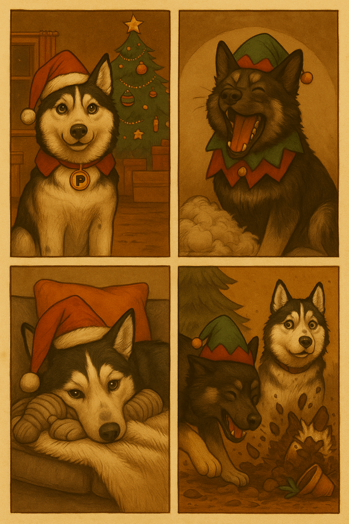 On a chilly December evening, the kind where the wind whispers things like put on socks, or your toes will fall off, Princess Athena the Elegant Menace awoke dramatically from her nap atop the sofa. Not on the sofa. Atop it. Draped with a blanket like a royal cape. Because she didn’t do things normally. She only did them fabulously. Her bi-eyes, one sky blue and the other rich chestnut, snapped open with the intensity of a dog who has realised there are leftovers somewhere in the house. Today, she had a mission. A purpose. A destiny. A level of self-importance matched only by celebrities and royalty. She leaped off the sofa in one graceful, unnecessary backflip and proclaimed to the universe, I shall become SantaPaws. The universe replied by knocking a plant off the windowsill, which she took as a sign of approval. But Athena knew one thing about legendary holiday figures, they never worked alone. Santa had elves. She needed an elf too. Preferably one with enthusiasm and a lack of bone-hurting common sense. Perfect. Time to wake Obito. Obito the Giant Walking Marshmallow was in the hall, sprawled on his back, snoring so loudly that the floorboards vibrated like he was trying to communicate with underground civilisations. His tan eyebrows, permanently stuck in an expression of confused delight, twitched as he dreamed of… who knows. Biscuits? Wrestling a cloud? Accidentally sitting on a vacuum? Athena booped his massive nose with her delicate paw. He didn’t wake up. She booped again. Nothing. She booped a third time with enough force to legally classify it as a misdemeanor. Obito’s entire body activated in an instant, exploding upright and launching a tidal wave of wet, sloppy kisses directly at Athena’s pristine face. Her fur stuck up in soggy triangles. Her dignity left the room quietly. Obito grinned so hard his tail knocked over a shoe rack. Good morning Princess Miss Pants! Athena wiped her face with the expression of a queen who had just been licked by a swamp creature. Thank you for that… exuberant awakening. But listen closely. I have chosen to become SantaPaws. And you, Obito, shall be my Christmas elf. Obito gasped so loudly he inhaled a dust bunny and sneezed it across the hall. I get SNACKS?! No. You get responsibilities. But Obito was so excited he attempted a victory dance. This involved slipping on the tile and sliding directly into a pile of laundry with the grace of a beached walrus. Athena pretended this was all part of the plan. With the new holiday hierarchy established, they began their training. Athena first led Obito into the garden, the place she normally refused to touch because dew dared touch her royal paws. And yet, bizarrely, this same princess would march proudly through muddy fields for hours like a soldier of chaos. But the garden? No. Too moist. Too grassy. Too offensive. Except today. Today she had a vision. Elf, she said with the authority of a small general who has just stolen a donut, Christmas cheer begins with landscaping. Obito blinked. Does landscaping have snacks? Athena ignored this and began digging a hole with the ferocity of a tiny, furry excavator powered entirely by spite and caffeine. Mud flew. Grass flew. Bits of daisies flew. A worm probably texted its family goodbye. Obito joined in with his own digging technique, which involved scooping dirt with his giant paws, missing the ground entirely, falling face-first into the hole he was digging, and needing Athena to drag him out like a potato stuck in a well. I AM A MUD POTATO he declared triumphantly. Athena sighed in that long-suffering way older sisters do. You are an elf. Please act like one. Once the garden had been transformed into what could only be described as the aftermath of a gopher rave, Athena announced phase two of SantaPaws preparations, The Furniture Olympics. She zoomed back inside, took a deep breath, and leapt over the couch like a majestic reindeer who had just discovered caffeine. Then over the coffee table. Then over the ottoman. Then, for dramatic flair, over Obito. Obito tried to copy her and immediately miscalculated the trajectory. He launched himself directly into the empty laundry basket, which then slid across the floor like a budget amusement park ride, carrying Obito with it until he crashed into the shoe cupboard. Athena, watching from atop the couch, nodded proudly. Impressive. Unconventional. Mildly terrifying. Perfect elf energy. Next, they needed a base of operations. Santa had the North Pole. Athena would settle for a massive blanket fort. By the time they finished, the fort consisted of every blanket in the house, every pillow within reach, three socks of unknown origin, and at least one slipper Obito stole because he thought it looked lonely. Inside the blanket fortress, Athena lit the metaphorical candle of destiny, which meant she stared at Obito intensely while he accidentally tore down an entire wall of the fort with one tail wag. Obito lay down, looking devastated. I broke Christmas. You break Christmas every day, Athena assured him. But that doesn’t mean it stops working. That evening, with their blanket fortress repaired (sort of), they began the final mission, delivering gifts around the house like true holiday icons. Athena selected each gift with care and meaning. Socks she had collected during her advent season of laundry thievery. A triangle made of sticks from the garden, which she believed contained powerful druid magic. A slightly chewed shoe, which she refused to admit she had chewed. A tennis ball she had stolen from Obito six months prior. Obito’s contributions were… unique. A half-eaten biscuit. A pinecone he found in his tail fluff. A slobbery kiss he gifted the air. And, finally, the gift of himself, which he delivered by sitting directly on top of Athena while she arranged presents. Eventually they curled up together, Athena draped across Obito’s massive potato-like body, Obito drooling lovingly across her nose. 