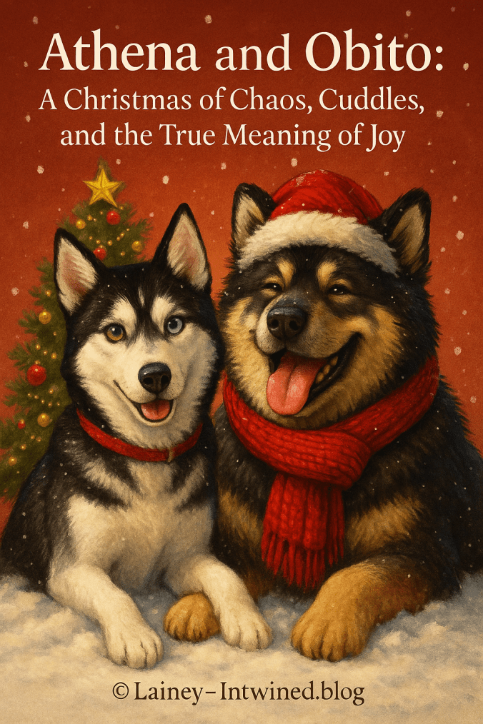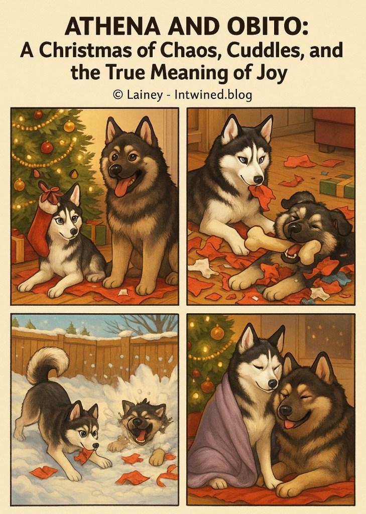 Merry Christmas from all of us at Intwined.blog (including a certain Princess Pants and her clumsy sidekick, Mr Toe Beans) 🎄 As we wrap up another year, Athena is insisting we use only the softest blankets for gift wrapping, while Obito has already tried to eat half the decorations (with great enthusiasm, but questionable success). Between her royal mischief and his goofy love, it feels only right that we pause to say a huge thank you to all of you, our wonderful readers. Whether you’ve joined us for the tales of husky and malamute mayhem, followed our family history threads, wandered through poetry, or tangled and untangled yarn right alongside our crochet projects, we’re so grateful for every single one of you. You’ve turned this little blog into a home filled with laughter, memory, creativity, and community. From Athena (currently sulking about wet paws in the garden), from Obito (who just learned the Christmas tree is not a chew toy), and from all of me, thank you for being here, for reading, and for sharing in the joy. May your Christmas be filled with love, laughter, warm blankets, wagging tails, and maybe just a little harmless chaos, the best kind. With love, gratitude, and sloppy malamute kisses, Lainey, Miss Pants and Mr Toe Beans 💕
