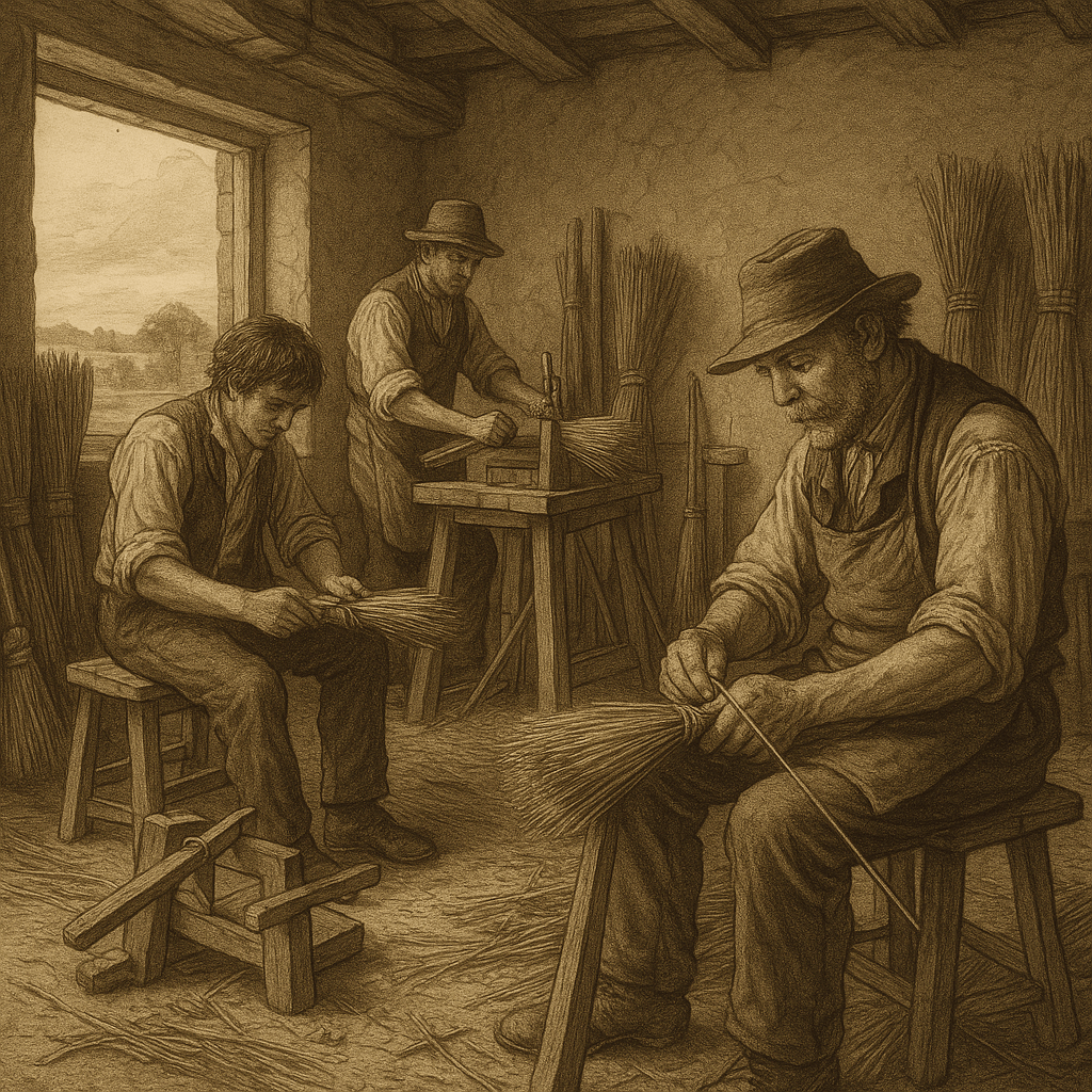 In 1851, Joseph’s work as a broom maker would have been both physically demanding and reliant on traditional craftsmanship. His days would have been filled with the preparation of broomcorn, which was a type of sorghum harvested in the late summer and fall. This was the main material for the brooms, with the stiff stalks used to form the brush. Joseph would have spent time gathering, soaking, and trimming the broomcorn to prepare it for use. The broomcorn had to be softened by soaking it in water before it could be properly shaped. After that, he would gather the bristles together and bind them to a wooden handle, which was typically made from local woods such as ash or hazel. Working as a broom maker required both skill and patience. The tools Joseph used were basic, sharp knives for trimming and cutting, a hammer for fixing the bristles to the handle, and twine or wire for binding. Though simple, these tools were essential for producing a functional broom, and craftsmanship was key to ensuring that the brooms would last. The process could be repetitive and labor-intensive, as the bristles had to be evenly spaced and securely attached, with the handle smoothed and shaped to ensure comfort during use. Each broom was a product of both skill and hard work, and a broom maker like Joseph would have honed his craft over years of experience. Joseph would have worked in conditions that were typical for rural trades in the 19th century. His workspace, whether it was a small shop or a corner of his home, would have been cramped, and during the darker months of the year, lighting would have been minimal. The work was done by hand, and Joseph would have spent long hours on each broom, especially when he was busy filling orders. The lack of artificial lighting would have meant working by daylight, and in the colder months, heating would have been minimal. The work itself could be physically taxing, with repetitive motions that might cause strain on the body, particularly on the back and wrists. The dangers of broom making were mostly linked to the sharp tools used for cutting and trimming, which could lead to accidental injuries. Additionally, the physical strain of long hours spent shaping the brooms could lead to musculoskeletal problems. There was also the potential risk of inhaling dust from the broomcorn or the wood, which might cause respiratory issues, a common concern in many small, rural trades. The process was not inherently dangerous compared to other labor-intensive trades, but like many manual occupations, it required constant care and attention to avoid injury. Joseph’s wages as a broom maker would have been modest, typical of rural craftsmen at the time. His income would have been dependent on the number of brooms he could produce and sell. It was common for a broom maker to earn between 5 to 10 shillings a week, depending on his output and the demand for his products. A well-made broom might have sold for 1 to 3 shillings, depending on the quality and materials used. The prices were relatively low, given that the materials, broomcorn, wood, and twine, were all fairly common, but the labor involved in making each broom was what defined its value. If Joseph worked for an employer, he would have received a fixed wage, which was typically lower than what a self-employed broom maker might earn from selling directly to customers. In this case, Joseph would have likely worked in a small workshop or factory under a larger employer who would provide the materials and handle the business side of things. His work would have been dictated by the employer’s needs, and while he may have enjoyed a degree of camaraderie with other workers, he would have had little say in the pricing or selling of the brooms. Alternatively, if Joseph was self-employed, he would have had more control over his work, but with it came the challenge of securing customers. In this case, Joseph would have had to sell his brooms directly to farmers, households, and businesses in the local area, perhaps even traveling to nearby towns like Romsey to reach new customers. He would have depended on word of mouth, referrals, and his reputation for quality to sell his products. Many rural craftsmen relied on local markets, going door-to-door or trading with other merchants, and Joseph would have been no different. Though being self-employed allowed him some independence, it also meant that Joseph was at the mercy of local demand and competition from other craftsmen. Whether working in a small workshop for an employer or as an independent craftsman, Joseph would have faced the realities of rural life in 1851, modest pay, long hours, and the physical demands of his craft. But despite the challenges, broom making was a valuable trade in rural communities, providing a practical tool needed by nearly every household and farm. In this sense, Joseph’s work, though humble, was a cornerstone of daily life, contributing to the smooth functioning of his community. The life of a broom maker like Joseph was shaped by hard work, the steady rhythm of labor, and the unspoken pride of crafting something that people depended on, even if it was something as simple as a broom.
