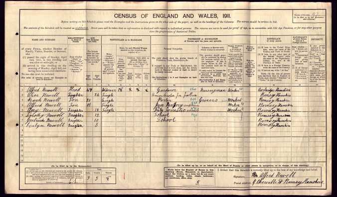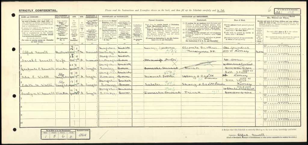 On the eve of the 1921 Census of England and Wales, Sunday the 19th of June 1921, Alfred, now 55 years old, found himself settled in the familiar surroundings of Number 29, Cherville Street, Romsey, Hampshire. At this point, Alfred had lived through decades of labor, love, loss, and change, his weathered hands now tending to the earth as a nurseryman gardener for Elcombe Brothers, a business he worked for on The Hundred in Romsey. Life was simpler now, though far from free of hardship, as he worked to provide for the family he had raised. At his side was Sarah, Alfred’s wife, who at 45 years and 11 months, had long taken on the role of housewife. Though her life had not been without sorrow, having been a widow before marrying Alfred, Sarah was a steady presence in the home, balancing the duties of the household with grace. The house, though modest with only four rooms, was filled with the lively presence of Alfred's children, some biological, some stepchildren, each with their own stories of growing up. In this close-knit family, Alfred’s daughter Gertrude, aged 18 and a half, was present as a visitor, working as a domestic servant. Gertrude, like many of Alfred’s children, had stepped into adulthood with responsibility, doing her part to support herself and contribute to the family. Two stepdaughters, Ada E. Watts, aged 19 years and 11 months, and Edith M. Watts, aged 17 years and 5 months, worked for Strong and Co. Ltd Brewers in Bell Street, Romsey. Ada worked as a mineral bottler while Edith served as a shop assistant. In addition to them, Evelyn K. Newell, a 12-year-old visitor, worked as a domestic servant in private employment at Number 14 The Hundred. Despite all the hardships, Alfred and Sarah’s family was a reflection of endurance, each child rising to the challenges of life with strength and determination, in the same way Alfred had done when he first laid roots in Romsey. They were a patchwork family, each piece unique, yet together, they formed a resilient and united unit. Alfred was proud of the life he had built, though tempered by the years of loss and grief he had endured. The family’s census return was completed and signed by Alfred himself, a man who had weathered the storm of life’s many challenges, from early laborer’s days to the loss of his beloved Estella, to the slow march of time. Each entry in the census, each note recorded with care, was a testament to the family’s strength and the life they had shaped from modest means.