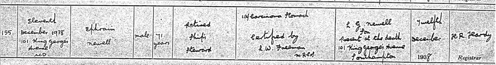 The death of Alfred’s brother Ephraim on Sunday, the 11th day of December 1938, at Number 101, King Georges Avenue, Southampton, must have brought a deep sorrow to Alfred’s heart. As the years had passed, Alfred, now growing older himself, would have felt the weight of a generation slowly slipping away. Ephraim, once full of energy and the spirit of adventure, had spent his later years as a retired ship’s steward. But his time had come to an end, taken by cancer of the stomach, a cruel thief of life. For Alfred, the loss of Ephraim was not just the passing of a sibling, but a reflection of the days gone by, of their shared childhood in Awbridge, of long hours worked side by side, of family gatherings, and of the silent moments they’d spent supporting one another through life’s triumphs and heartaches. Ephraim’s death followed just one year after the loss of their sister Ellen, further deepening the silence that had fallen over the Newell family. Alfred must have felt a bittersweet pride as he watched his nephew, Leslie George Newell, step forward to register his father’s death on Monday, the 13th day of December. Leslie, Ephraim’s son, would have taken the mantle of responsibility, one Alfred himself had once carried, and it may have been a quiet reminder of the passing of time, how the younger generation had to rise, even as his own contemporaries slowly left this world. It was a duty that carried with it the weight of love and remembrance, even as it also marked the closing of yet another chapter. Leslie George, who was present at his father’s death, made the solemn visit to the registrar’s office where H.R. Hardy filled in the official details. The entry in the death register was simple yet poignant, a factual record of Ephraim’s passing, but for Alfred, it was much more. It was the closing of a shared history, one that he could never fully articulate but would carry with him in the quiet corners of his heart. No.: 155 When and Where Died: Eleventh December 1938, 101 King Georges Avenue, S.D. Name and Surname: Ephraim Newell Sex: Male Age: 71 years Occupation: Retired Ship Steward Cause of Death: (a) Carcinoma Stomach Certified by: L.W. Freeman, M.R.C.S. Signature, Description, and Residence of Informant: H.G. Newell, Son, Present at the death, 101 King Georges Avenue, Southampton When Registered: Twelfth December 1938 Signature of Registrar: H.R. Hardy, Registrar. Though the world around Alfred moved on, Ephraim’s absence remained a hollow space, a quiet ache that only a brother could truly understand. At this point, the exact location of Ephraim’s burial remains unknown, and though it is clear that he was not laid to rest in Awbridge, the search for his final resting place continues. It is a search that echoes the steady pulse of Alfred’s life, moving forward, never forgetting, and always seeking to honor the memory of those who came before.