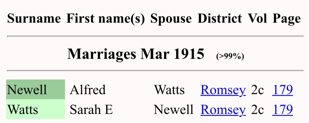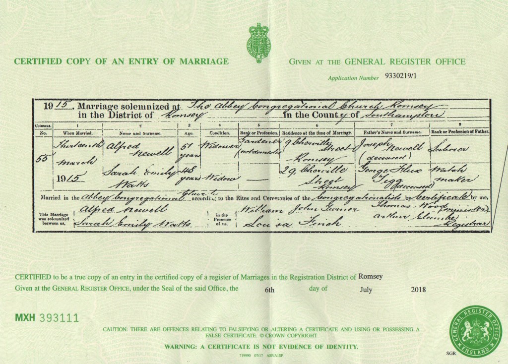 In the early months of 1915, Alfred Newell, the son of Alfred and Estella, married Sarah Ellen Watts, his stepsister and the daughter of his stepmother Sarah and her first husband, the late Alfred Watts. At 22 years old, Alfred stood at the threshold of a new chapter in his life, one that would shape the future of his family and carry forward the legacy of love, resilience, and devotion that had been instilled in him by his parents. The wedding took place in the Romsey district of Hampshire, a place that had long been home to the Newell family, where the earth had nurtured their roots and hearts for generations. The union between Alfred and Sarah was not just the joining of two people, but the merging of two lives built upon hard work, shared values, and enduring love. It was a union grounded in simplicity, where promises were made not just with words, but through the actions of everyday life. In the presence of close friends and family who understood the weight of what they were committing to, Alfred and Sarah embarked on their journey together, knowing that love and family were the foundations that would see them through all things. However, the rising costs of family history research, including certificates for births, marriages, and deaths, have made it difficult to continue to gather each and every detail that would paint a fuller picture of Alfred’s story. This reality weighs heavily on me, as each certificate holds a key to a chapter in his life and his descendants’ journeys. With a heavy heart, I’ve had to make the difficult decision to not purchase further certificates that are not already part of the collection. It’s a decision that saddens me, as I long to tell every part of Alfred’s story in its full richness and depth. For those who wish to explore further details of Alfred and Sarah’s marriage, including their witnesses, the specifics of the ceremony, and more, the marriage certificate is available through the General Register Office. You can obtain a copy with the following reference: Marriages - Mar 1915, Newell, Alfred, Watts, Sarah, Romsey, Volume 2c, Page 179. This certificate will offer more insight into their shared life, a testament to their promise, love, and the new beginning they embarked upon together.