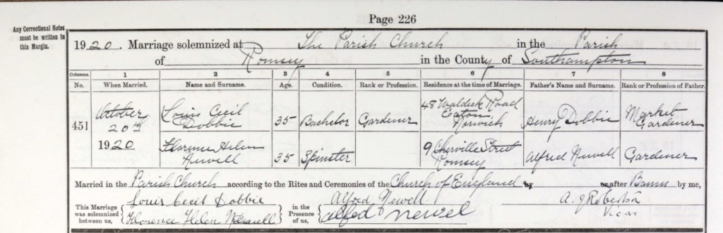 On the crisp autumn day of Wednesday the 20th day of October 1920, the air was filled with an almost sacred stillness as sunlight filtered gently through the stained-glass windows of Romsey Abbey. Alfred stood with quiet dignity, his heart heavy with both pride and sorrow, as he awaited the moment when he would give his daughter, Florence Helen, to a new life with Louis Cecil Dobbie. The moment should have been filled with the unclouded joy of a father giving away his daughter to the man she loved. But there, in that sacred space, a piece of Alfred’s heart was missing. Beside him, there was no Estella, his beloved late wife, and Florence’s mother, to share this bittersweet moment. Estella had been gone for nearly thirteen years, but her absence was as tangible as ever. Alfred’s eyes may have lingered on the place where Estella should have stood. He could feel her presence in the stillness around him, in every step Florence took as she made her way toward Louis. It was a moment filled with memories, of Estella’s laughter, of the home they had built together, of the family they had raised. Florence, though not his daughter by blood, was his daughter in every other way that mattered. He had raised her with the same unwavering devotion and deep love that he had given to his own children. In his heart, she was no different, and in that moment, as he stood beside her, Alfred’s love for Estella intertwined with his love for Florence. With both sorrow and pride interwoven, Alfred walked his daughter down the aisle and, with trembling hands, gave her away to Louis. He knew that Estella, though no longer physically present, would have been so proud of Florence, and in some unspoken way, she walked beside them both. The ceremony, conducted by the Reverend A. J. Robertson, was simple, but filled with profound significance. It was not just a union of two people; it was a union of hope, legacy, and enduring love. It was a testament to the strength and resilience of Alfred’s family, a family whose love had carried them through the pain of loss and the joy of new beginnings. As the ceremony concluded, the marriage register was filled out and signed. The details were recorded with the same care that had guided their lives up to that point. The ceremony was solemnized at The Parish Church in Romsey, and though the official words marked the end of one chapter, they also marked the beginning of another, one filled with promise and love, as Alfred passed the torch of family to a new generation. Marriage solemnized at The Parish Church, Romsey in the County of Southampton in the year 1920 Page: 226 Entry No.: 451 When Married: October 20th, 1920 Name and Surname: Louis Cecil Dobbie, Florence Helen Newell Age: 35, 35 Condition: Bachelor, Spinster Rank or Profession: Gardener, [not listed] Residence at the time of Marriage: 48 Waldeck Road, Eaton, Norwich, 9 Cherville Street, Romsey Father’s Name and Surname: Henry Dobbie, Alfred Newell Rank or Profession of Father: Market Gardener, Gardener . Married in the Parish Church, according to the Rites and Ceremonies of the Church of England, by: A. J. Robertson, Vicar, After Banns . This Marriage was solemnized between us: Louis Cecil Dobbie and Florence Helen Newell, In the Presence of us: Alfred Newell Ethel Newell. The Abbey, a place where so many farewells and new beginnings had occurred before, cradled them all in its timeless grace, as Alfred’s love for Estella remained alive in every step he took, and in every word he whispered to his daughter on this momentous day.