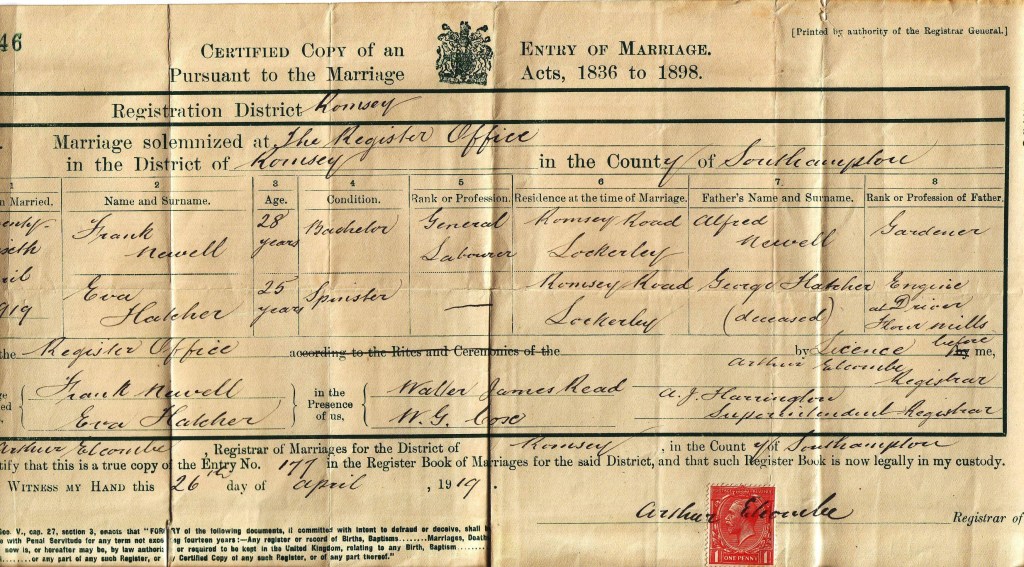 As Alfred stood quietly in the Romsey Register Office on that Saturday, the 26th day of April 1919, his heart swelled with both pride and bittersweet reflection. He watched his firstborn son, Frank, take Eva Hatcher's hand in marriage, a moment that marked not just the beginning of a new chapter for Frank, but also a passing of the torch, a father watching his son step into a world of his own, just as Alfred had once done. It felt as if time had flown, and the memories of guiding him through the years in the garden seemed like a distant echo. But now, here stood Frank at 28, strong and capable, ready to begin a new life with Eva by his side. The weight of Alfred’s past, his love for Estella, and the years of shared family memories hung in the air, though the day was filled with promise. As Frank and Eva stood before the registrar, Alfred could not help but remember the love that had shaped him and his family. His heart, while heavy with remembrance, was filled with the quiet joy of seeing his son embark on his own journey. The register they signed bore the simple yet solemn details of the day, but for Alfred, it marked a much deeper moment, a moment of hope for Frank’s future and a quiet tribute to the love that had endured through the years: Marriage solemnized at: The Register Office in the District of Romsey In the County of: Southampton Date of Marriage: 26th April 1919 Names and Surnames: Groom: Frank Newell, Bride: Eva Hatcher Ages: Frank: 28 years, Eva: 25 years Condition: Frank: Bachelor, Eva: Spinster Rank or Profession: Frank: General Labourer, Eva: [Blank] Residence at the time of marriage: Frank: Romsey Road, Lockerley, Eva: Romsey Road, Lockerley Fathers' Names: Frank’s Father: Alfred Newell, Eva’s Father: George Hatcher (Deceased) Rank or profession of father: Frank’s Father: Gardener, Eva’s Father: Engine Driver at Flour Mills. Married in The Register Office by Licence before me Registrar: Arthur Elcombe and Superintendent Registrar: A.J. Harrington. This Marriage was solemnized between us: Frank Newell Eva Hatcher In the Presence of: Walter James Read and W. G. Loose Arthur Elcombe, Registrar of Marriages for the District of Romsey in the County of Southampton I clarify that this is a true copy of the entry No. 177 in the Register Book of Marriages for the said District, and that such Register Book is now legally in my custody. WITNESS MY HAND this 26th day of April 1919, Arthur Elcombe, Registrar. As Frank and Eva penned their names into the register, Alfred stood at a quiet distance, his thoughts drifting to Estella, the love of his life who had been taken from him far too soon. He whispered a silent prayer for their future, for joy, for strength, and for a love that would bloom, much like the one he had once shared with Estella. In that moment, Alfred wasn’t just a father giving his blessing; he was a man honoring the past, cherishing the present, and praying for the future. The road ahead for Frank and Eva was theirs to walk, but Alfred’s quiet presence that day was a gentle reminder that love, like family, never fades.