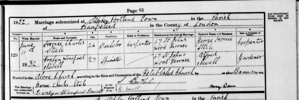 On Saturday, the 11th day of June 1932, in the reverent stillness of St Stephen the Martyr Church, Avenue Road, Portland Town, Hampstead, Middlesex, Alfred’s daughter Evelyn Winifred Newell stood at the altar, ready to pledge her life to Horace Charles Steele. A 24-year-old carpenter, Horace stood beside her, his heart bound to hers as they prepared to exchange vows that would forever intertwine their lives. Evelyn, at 27, entered the church as a spinster but walked out of it as a wife, forever changed by the commitment they both made in that sacred space. As they stood together in front of the altar, their lives forever altered by the vows they exchanged, Evelyn carried not only her name but also the quiet, enduring love of her father, Alfred Newell. Though it is unclear if Alfred was present to witness this significant moment, his presence was felt deeply, woven into Evelyn’s very being. His love, steadfast and patient, had shaped her into the woman standing before Horace, and it was that love that she carried with her as she began this new chapter of her life. The memory of Alfred, a hardworking gardener who had devoted his life to his family, stood beside her even in his physical absence. The essence of Alfred’s love, sacrifice, and guidance lingered in every step she took, and even in this profound moment of change, she was not without him. As they exchanged their vows in front of the Reverend Henry Dann, Evelyn’s sister, possibly Ellen Gertrude Newell, stood as a witness, a quiet reminder of the importance of family at such significant moments. The ceremony was conducted according to the rites of the Church of England, a ritual that, while binding Evelyn and Horace in legal matrimony, also marked the beginning of a new journey for Evelyn, a journey filled with both the memories of her father and the promise of a future with Horace. After the ceremony, the marriage register was signed, the legal formalities carried out with solemn reverence. The details of the day were documented for posterity in the official church record: No.: 129 When Married: June 11th, 1932 Name and Surname: Horace Charles Steele, Evelyn Winifred Newell Age: 24, 27 Condition: Bachelor, Spinster Rank or Profession: Carpenter, [Not listed] Residence at Time of Marriage: 67 St John’s Wood Terrace, 67 St John’s Wood Terrace Father’s Name and Surname: George Horace Steele, Alfred Newell Rank or Profession of Father: Carpenter, Gardener Married in the Above Church According to the Rites and Ceremonies of The Established Church by (or after) Banns By me: Henry Dann This marriage was solemnized between us: Horace Charles Steele Evelyn Winifred Newell In the presence of us: G. Newell J. Berthelang [Signature unclear] As the register was signed and the ceremony came to a close, the day marked more than just a legal union, it symbolised the continuation of the Newell legacy, carried forward in the strength and gentleness Evelyn had inherited. In marrying Horace, Evelyn was not only beginning a new chapter in her life but was also bringing with her the love, values, and memories of her father, Alfred.