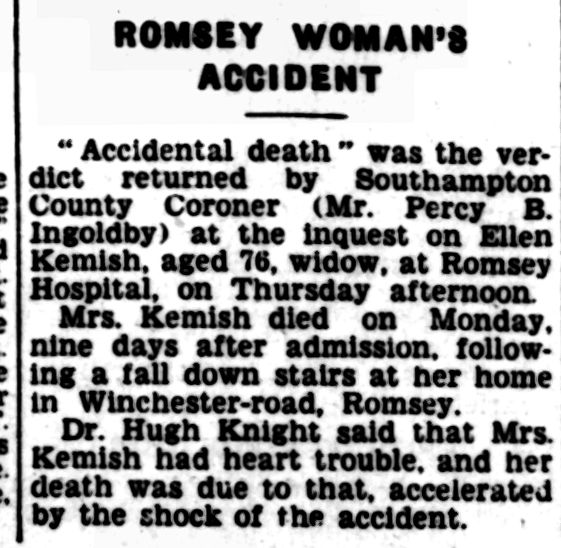 "Accidental death" was the verdict returned by Southampton County Coroner (Mr. Percy B. Ingoldby) at the inquest on Ellen Kemish, aged 76, widow, at Romsey Hospital, on Thursday afternoon. Mrs. Kemish died on Monday, nine days after admission, following a fall down stairs at her home in Winchester-road, Romsey. Dr. Hugh Knight said that Mrs. Kemish had heart trouble, and her death was due to that, accelerated by the shock of the accident.