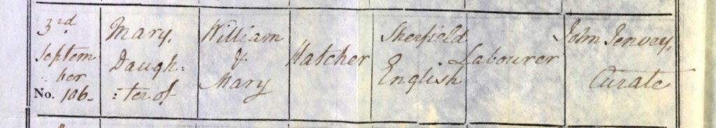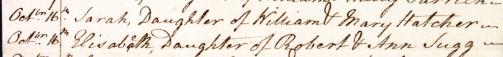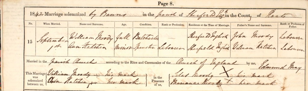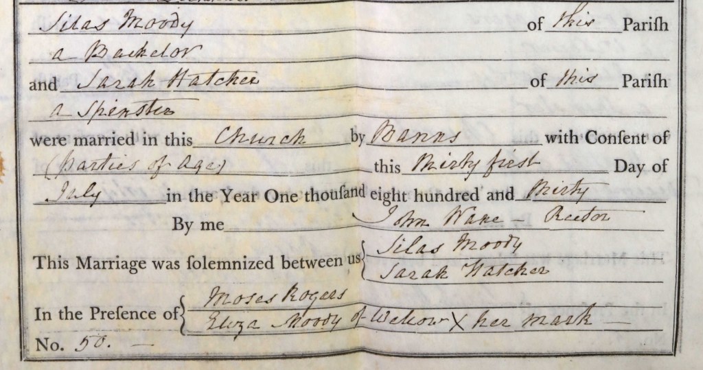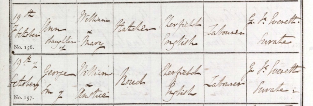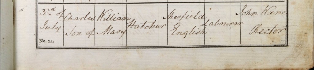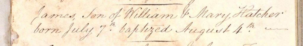 “Banns of Marriage between William Hatcher & Mary Roud were published April 19th, 26th & May 3rd, 1807. William Hatcher of this Parish Bachelor and Mary Roud of this Parish Spinster were Married in this Church by Banns this eighteenth Day of May in the Year One Thousand Eight Hundred and Seven by me John Wane, Rector. This Marriage was solemnized between Us: William Hatcher X his mark,