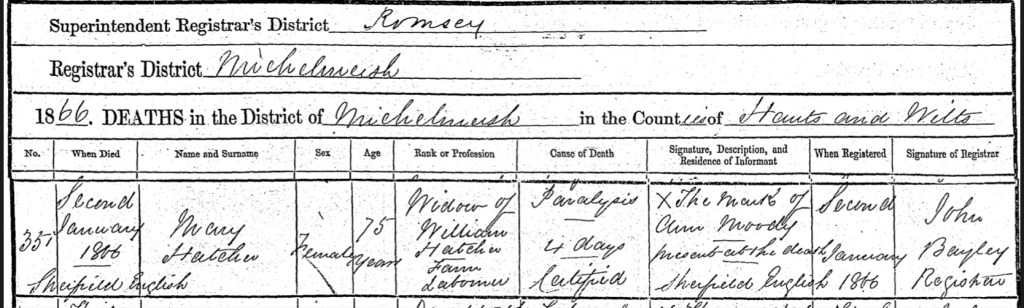 On a cold winter’s day, Tuesday, the 2nd day of January 1866, the village of Sherfield English witnessed the quiet passing of one of its most steadfast residents. Mary Hatcher, at the age of 75, drew her final breath in the home she had shared with her late husband, William. For so many years, Mary had been the heart of her family, a woman whose life was defined by resilience, sacrifice, and a profound love for those she held dear. She had weathered many storms, most notably the loss of her beloved William six years earlier, and had continued to live with strength, even as the challenges of life had taken their toll. But in her final days, it was her own body that betrayed her, as she endured a long and difficult struggle with paralysis. For two weeks, she battled against the slow, cruel progression of her illness, but as the end came, she was not alone. Her daughter, Ann Moody, remained lovingly by her side, offering what comfort she could as her mother slipped away.