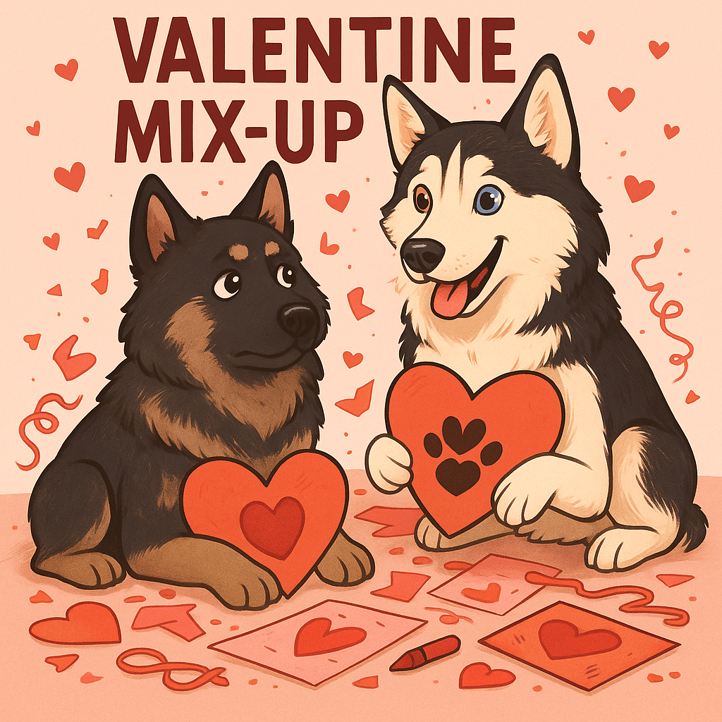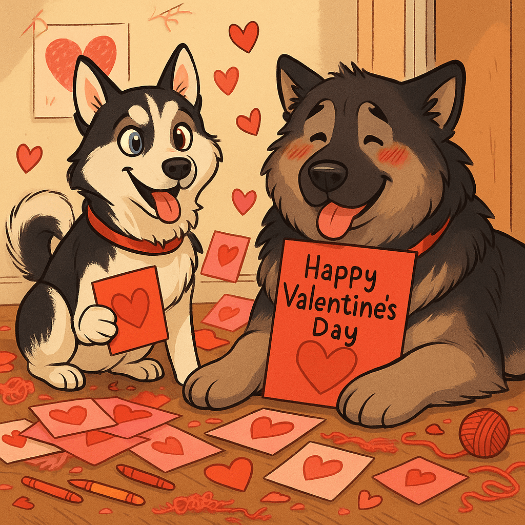 Athena woke up that morning with a burst of energy that could have powered an entire city. Her tail whipped back and forth like a metronome gone rogue, her ears perked, and her nose twitched at the faint scent of something sweet lingering in the kitchen. Valentine’s Day. She didn’t understand all the human fuss about it, but she did understand two very important things: chocolate was bad for dogs, and treats, squeaky toys, and cuddles were extremely good. And Obito… Obito deserved the very best Valentine’s Day ever. She trotted over to her little stash of crafting supplies, the remnants of a particularly chaotic afternoon when she had managed to shred a roll of construction paper in exactly three seconds, and began fashioning her plan. Today, she was not just Athena the Husky. No, today she was Athena the Matchmaker. She had spotted that Obito’s friends at the dog park had been looking a bit… lonely. Some were shy. Some were goofy. Some were downright dramatic. And she was going to fix that, one handmade Valentine at a time. By the time she finished, the living room looked like a tornado had struck a paper factory. Little hearts were strewn across the floor, some stuck to her paws, some stuck to her nose. Yarn had been shredded into oblivion. Crayons were everywhere. And in the middle of it all sat Athena, triumphant, surrounded by a dozen Valentine cards, each with a carefully chosen pawprint for Obito’s friends. She was extremely proud. She grabbed the first card “For Luna, the fastest Greyhound in the park!” and trotted toward the door, ready to deliver her masterpieces. But disaster struck almost immediately. A gust of wind, a mischievous squeak from a toy she had forgotten under the couch, and one Valentine card a very special one, meant for Obito himself, slipped from her paws. It fluttered down the hallway like a red, paper butterfly and landed squarely in the middle of Obito’s favorite nap spot. Obito, the ever-sleepy Malamute, opened one eye, saw the card, and immediately assumed Athena had written something incredibly romantic… to him. His tail began a slow, confused wag. Athena, unaware of the disaster unfolding, was outside distributing the other cards with the precision of a very excitable postal worker. The park was chaos from the start. Athena bounded from one dog to the next, dropping cards, sniffing noses, and occasionally tripping over her own paws in dramatic fashion. Luna got her Valentine and promptly tore it into ribbons with a flick of her teeth. Max, the tiny Shih Tzu, stared at his card suspiciously before deciding it was a chew toy and running off in a blur of fluff and panic. Athena barely had time to breathe when she spotted Obito, who had just arrived at the park, trotting toward her with a slow, dreamy smile that made her tail wag uncontrollably. “What’s wrong with him?” Athena muttered to herself, realizing that he seemed… distracted. Every time she looked at him, he blinked slowly, tilted his head, and sighed dramatically. He even tried to sit down in the middle of the sandbox, completely ignoring a squirrel that ran across the bench. Athena frowned. Maybe she had overdone it with the decorations? Then it hit her. The card. The one she had accidentally dropped. Obito had found it and assumed… oh no. Oh no no no. He thought Athena’s elaborate, chaotic, paw-painted card was a secret Valentine just for him. And now, instead of a simple day of friendship matchmaking, she had inadvertently set off what could only be described as a “puppy love panic.” The rest of the day became a whirlwind of chaos and hilarity. Obito followed her everywhere, staring at her with intense, overly dramatic puppy eyes that could melt steel. Every time another dog got a card, he would growl, softly, in a concerned way, like a noble guardian of Athena’s affections. Athena tried to explain, but her husky barks came out as garbled yips, which only made Obito tilt his head even more. At one point, Athena tried to discreetly deliver a card to a particularly shy beagle named Daisy, only for Obito to barge in, trying to “protect” her from the Valentine he thought Athena had written. Daisy yipped, ran in circles, and somehow ended up tangled in a leash that belonged to a very grumpy pug named Mr. Wiggles. Athena spent a solid ten minutes untangling the mess while Obito sat nearby, looking mortified that anyone could misunderstand her Valentine intentions. By the time the sun began to set, Athena was exhausted, her fur dusted with stray bits of heart-shaped paper and yarn, and Obito was lying next to her, head on her shoulder, sighing in a way that made Athena feel both guilty and ridiculously loved. She realized that in all the chaos, she hadn’t just tried to make Valentine’s Day special for Obito’s friends… she had made it special for him, too. Not because she had written a secret love letter, but because she had poured every ounce of her excitement, mischief, and affection into making a day full of happiness. Athena nuzzled him, and for the first time, Obito gave her a proper, sloppy Malamute kiss that made her stumble backward into the last remaining pile of yarn. They collapsed together, covered in chaos, laughter, and a million tiny heart-shaped confetti pieces, and for a long while, they simply sat there, perfectly content. Valentine’s Day might have been a mess. It might have involved misunderstandings, chaos, shredded paper, tangled leashes, and the occasional dramatic howling. But in the end, Athena and Obito realised something wonderfully simple: love didn’t need to be neat, planned, or even perfectly understood. Sometimes it was just a day full of laughter, mischief, and knowing that no matter what happened, you had each other. And maybe, just maybe, a few extra treats wouldn’t hurt either.