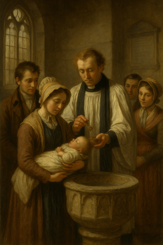 In 1828, the baptism of Louisa and Joseph’s firstborn son, Joseph Newell, would have been a deeply significant event, both for the child and for the family. Sherfield English, a small rural village in Hampshire, would have had a modest country church, St. Leonard's Church, its ancient walls holding the echoes of countless baptisms before. The Sunday service was a sacred occasion, and baptisms were integral to the rhythm of village life. For a family like Louisa and Joseph’s, this would have been a day of immense joy, devotion, and deep reflection, as they prepared to commit their child to a life of faith and belonging in the Christian community. The preparation for the baptism would have been a mix of personal and religious duties. Louisa, as the mother, would likely have prepared herself spiritually and emotionally, understanding the solemnity of the sacrament. Baptism was not merely a social event but a spiritual one, marking the child’s formal initiation into the Christian faith. Joseph, too, would have taken part in the preparations, ensuring that the family was ready for the event. The family would likely have had some private moments in the days leading up to the baptism to reflect on the significance of what was about to take place. For Louisa, there would have been the practical preparations, perhaps arranging for clean clothes for the baby and the family, preparing a small offering for the church, and attending to other ceremonial details. Baptism during this time was often held during the Sunday service, meaning that the family would have arrived at the church a bit earlier than usual to make the necessary preparations. On the Sunday morning of the baptism, the service would begin in the usual manner with prayers, hymns, and scripture readings. St. Leonard’s, though not a grand building, would have been a place of beauty and reverence. The small congregation, made up of families from the village, would gather for the service, with everyone acknowledging the importance of the sacrament about to take place. The church, lit by candles and the warm light filtering through the windows, would have held an atmosphere of quiet anticipation. The officiating minister, in this case, Reverend Thomas Pentin, the curate of Sherfield English, would have led the congregation through the usual prayers and scripture readings. The readings would have been from the Book of Common Prayer, a beloved Anglican text that guided services and sacraments across the country. The prayers said by the priest would have been a mix of thanksgiving for the child, prayers for protection and guidance, and a plea for God to bless the child and watch over them through their life. As part of the service, traditional hymns would have been sung, with the congregation joining in the familiar, sacred melodies. Hymns like “All Things Bright and Beautiful” or “Praise God from Whom All Blessings Flow” might have been sung, as these were common during the period. The church would have been filled with the sound of voices raised in unity and reverence, a beautiful symbol of the Christian community that was about to welcome this child into their fold. The prayers of the service would have followed the ancient format laid out by the Church of England. The priest would have read the opening prayers, invoking the name of the Father, the Son, and the Holy Spirit. He would have reminded the congregation of the importance of the sacrament, emphasizing that baptism was an act of faith, a moment where the child was cleansed of sin and made a member of the Christian community. When it was time for the baptism, Louisa and Joseph would have brought their son forward, likely to the font at the front of the church. In a small village church like St. Leonard’s, the baptism would have been a communal act, witnessed by the villagers who were both friends and family. The water, blessed by the priest, would have been poured over Joseph’s head, or he may have been fully immersed depending on the tradition of the parish. This was the moment that marked the beginning of his spiritual journey. The reverence in the air would have been palpable, as the priest recited the sacramental words: "I baptize thee in the name of the Father, and of the Son, and of the Holy Ghost." During the baptism, there would likely have been the lighting of a baptismal candle, a common practice that symbolised the light of Christ now shining in the child's life. The parents, and perhaps the godparents, would have stood in solemn reflection as their child was baptized. In 1828, it was traditional for the child to have godparents. The godparents would have been close family members or friends chosen by Louisa and Joseph to stand as spiritual guides for their son. The role of godparents was vital in this period, as they were seen as spiritual mentors to the child, responsible for ensuring that the child was raised in the Christian faith, especially if anything were to happen to the parents. Typically, godparents would be individuals with a good reputation in the community, often people who could afford to help with the child’s spiritual upbringing. For a boy like Joseph, the godparents would likely have been men and women from within the close-knit community of Sherfield English, perhaps even cousins or longtime family friends. The names of the godparents would be recorded in the church register, alongside the birth details, signifying their role in the child’s life. After the baptism ceremony, the minister would have recorded the event in the church’s baptismal register. Reverend Pentin would have taken his quill, dipped it in ink, and carefully written down the details of the ceremony, the child's name, the date, the parents' names, the place of birth, and the names of the godparents. The entry would have been written in neat, looping script, and the document would have been a permanent record of the child’s entry into the Christian community. Lo