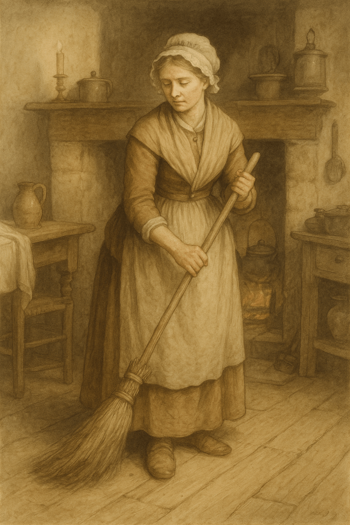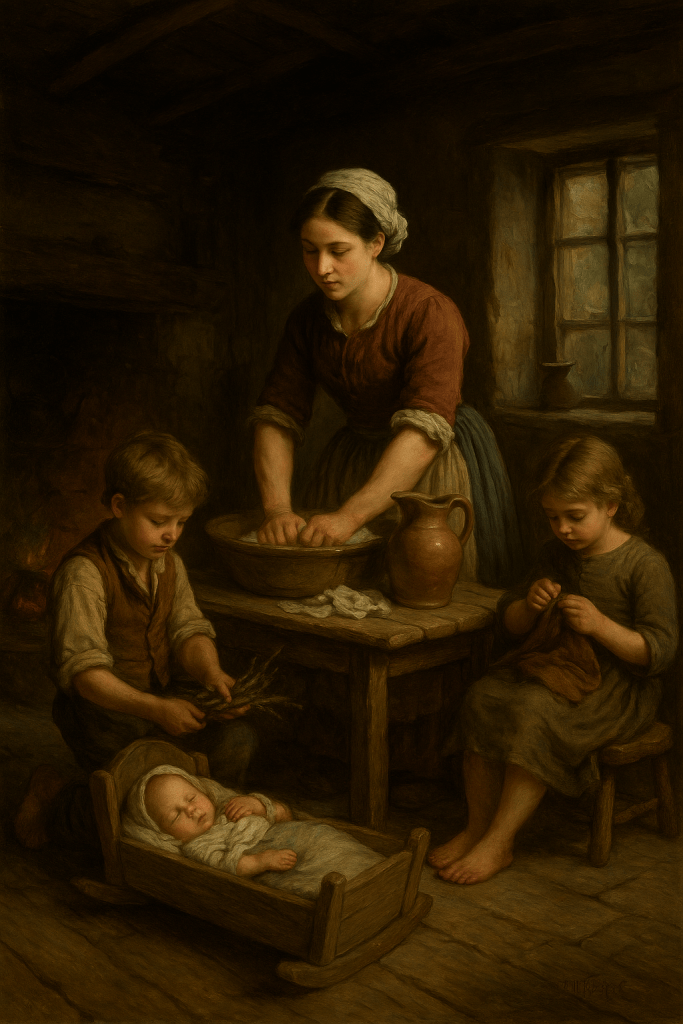 By firelight she tends, by dawn she wakes, With bread to knead and beds to make, The hum of the broom, the clatter of pan, Each task a testament to the life she began.