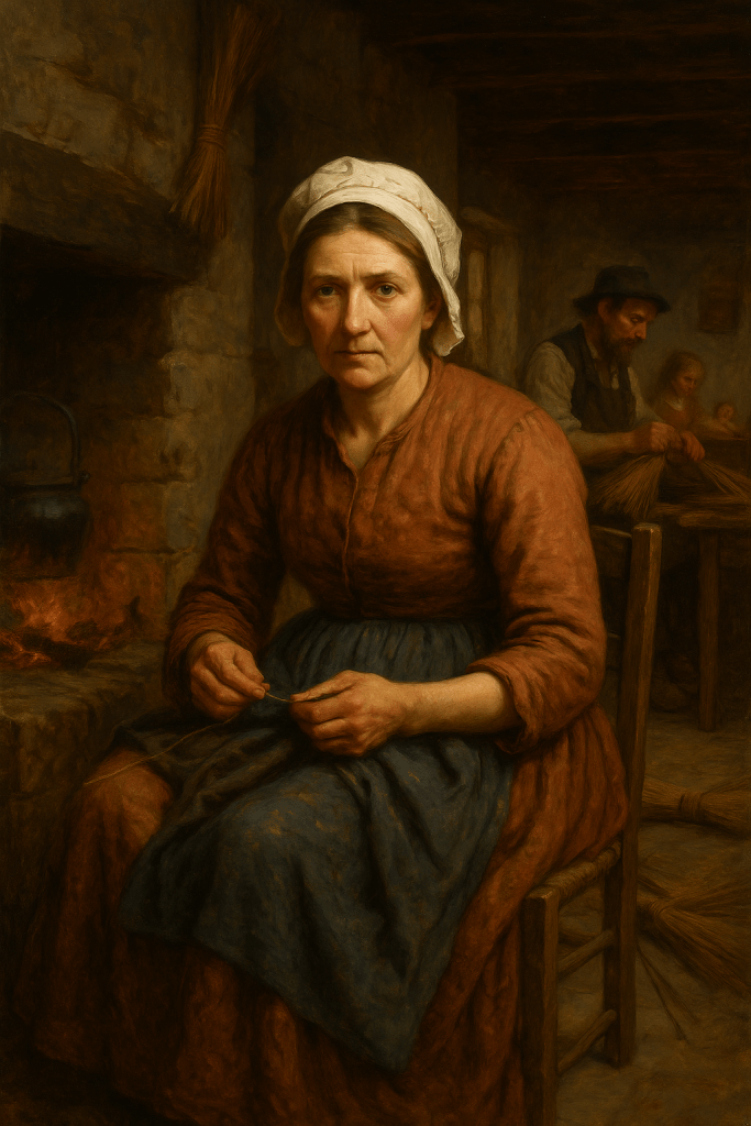 In 1851, life for Louisa as the wife of a broom maker in the rural village of Awbridge, Hampshire, would have been shaped by the rhythm of daily labor, responsibility, and care for her growing family. At 46 years old, Louisa had lived a life marked by the cycles of the seasons, the ever-present tasks that came with running a household, and the love that she poured into raising her children. Her life, though simple in material means, was rich in the daily duties of motherhood and homemaking, and every day was defined by both routine and the tender moments she shared with her family. Her husband Joseph, a broom maker, would have spent much of his day working in the small workshop, his hands busy with the craft of weaving the broom heads and making the handles. As a family business, this work was essential not only for Joseph but for their livelihood. Louisa, while not directly involved in the broom-making process, would have been there to support him in every way she could, providing him with food, comfort, and the kind of quiet partnership that allowed the work to continue smoothly. The home was where Louisa’s influence was most felt, where she managed the practicalities of their life together, while Joseph focused on his craft. Her own day would have begun early, often with the first light of dawn. She would rise from the small bed she shared with Joseph, making sure the house was in order for the day ahead. The fire in the hearth would need tending, and the stove would need to be prepared for cooking the day’s meals. Louisa would have started the day by making breakfast for the family, likely porridge or bread, simple foods that could be prepared with the ingredients they had on hand. This would have been the first of many tasks she completed by hand, from the sweeping of the floor to the washing of clothes, all done with the same quiet dedication. Once the children awoke, Louisa’s attention would shift to them. Her older children, like Joseph Junior and Emma, were already old enough to help with the daily chores around the home. Joseph Junior would assist his father in the workshop or with carrying out broom-making orders, while Emma and Mary Ann, at 14 and 11, would help Louisa with more domestic tasks. Louisa would oversee the younger children, ensuring they were fed, clothed, and ready for school. Sarah and Eliza, being school-aged, would head off to the village school, while Louisa might spend time with her youngest children, teaching them basic lessons of reading or helping them with any small tasks they could manage. As the day went on, Louisa would keep busy with the ongoing work of maintaining the home. She would tend to the garden or assist Joseph with other tasks around the house. She might spend time sewing or mending clothes, patching up worn garments, as clothing was something to be cared for and reused as much as possible. The act of stitching and sewing would have been a source of both necessity and solace for Louisa, a moment of quiet focus in a day that was often filled with the noise and movement of her children and the demands of the house. In the afternoon, as the children returned home from school, Louisa would prepare the evening meal. The day would wind down with dinner, a simple affair, perhaps involving stew, bread, and any vegetables from the garden. The family would gather together around the table, and in the warmth of the hearth and the soft flickering of candlelight, Louisa would feel the strength of the family unit she had helped nurture. Even in the midst of physical exhaustion, Louisa would take comfort in the quiet moments of connection that marked the end of each day, whether it was listening to her children talk about their school day, enjoying the peace of a shared meal, or having a conversation with Joseph about the work of the day. In the evening, once the children were in bed, Louisa would likely take some time to tidy up and prepare for the following day. With Joseph working in the shop, Louisa might enjoy a quiet moment of reflection. These rare moments of stillness were her time to recharge, though her thoughts would often be with her family, planning for the needs of the next day, the next week, and the future. Her life, while filled with hard work, was always rooted in the quiet, enduring love she felt for her family. In the wider community of Awbridge, Louisa’s role as a wife and mother was a cornerstone of the village. While she may not have held a formal position in the community, her influence was felt in her contributions to village life. She would have attended church on Sundays, along with Joseph and the children, where they would gather with other families. Her life was marked by these subtle but important contributions, the steady hands that mended the clothes of her family, the meals she prepared, the children she nurtured, and the love she quietly gave. Life for Louisa was filled with the simple joys of family, the hard work of maintaining a household, and the deep love she shared with Joseph and their children, all of which were built on the solid foundation of faith and commitment to her family and their community.