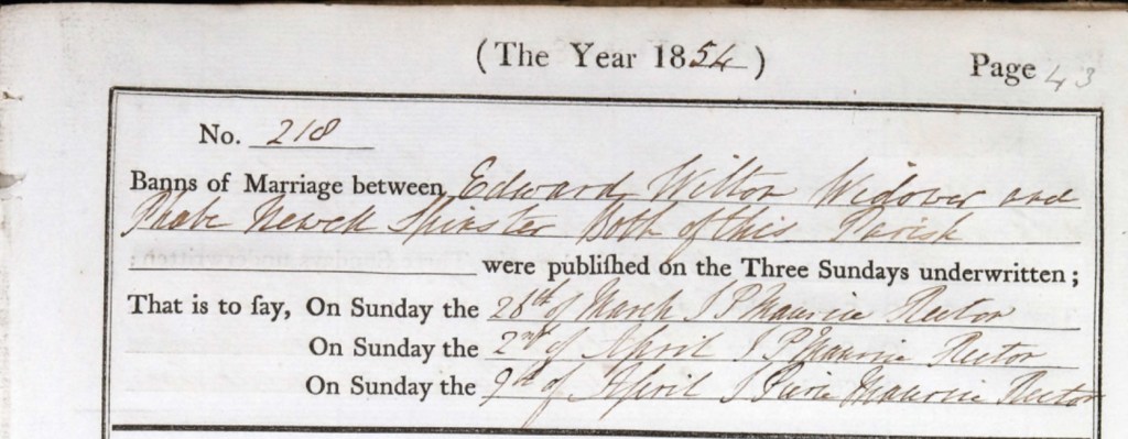 In the spring of 1854, the quiet stone walls of St. Mary’s Church in Michelmersh, Hampshire, England, stood witness to a tender and hopeful chapter in the life of Louisa and Joseph’s daughter, Phoebe Newell. Listed in the parish records as a spinster, Phoebe now approached the threshold of a new beginning, preparing to marry Edward Wilton, a widower whose roots were entwined in the same familiar parish. Edward was the brother of Jane Newell, formerly Wilton, who had married Louisa’s son Joseph, and so this union brought family ties and shared histories even closer. The banns of their marriage were read aloud with gentle solemnity by Rector J. Pierce Maurice on three successive Sundays, first on the 26th day of March, again on the 2nd day of April, and finally on the 9th day of April, 1854. With each public reading, the congregation was invited to offer their support or voice any rightful objections, though none were raised. For Phoebe, whose life had been shaped by the quiet rhythms and small joys of parish life, each reading would have been a moment of reflection, anticipation, and cautious excitement, a chance to embrace love, stability, and the promise of partnership. The names of Edward and Phoebe, lovingly inscribed in the parish records, echo softly through time, a testament to a woman ready to step forward, not merely into marriage, but into the responsibilities, joys, and shared life that lay ahead. This moment, both ordinary in its communal observance and extraordinary in its personal significance, marked a new chapter, where hope intertwined with family bonds, and love, seasoned by experience, offered the promise of the future. Marriage Banns Record: Year: 1854 Page: 43 No.: 210 Banns of Marriage between Edward Wilton, widower, and Phoebe Newell, spinster, both of this parish, were published on the three Sundays underwritten: Sunday the 26th of March – J. Pierce Maurice, Rector. Sunday the 2nd of April – J. Pierce Maurice, Rector. Sunday the 9th of April – J. Pierce Maurice, Rector.