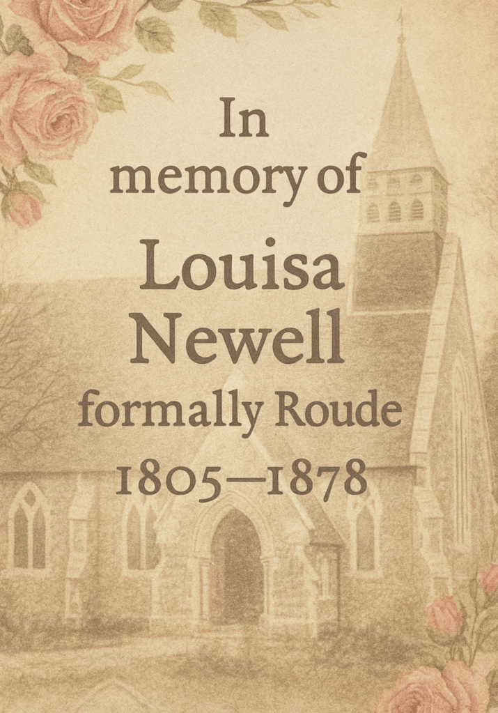 Louisa Newell, formerly Roude, my paternal fourth great-grandmother, lived a life that, though I never met her, has touched my soul across the years. Her days were filled with quiet devotion, love, and labor, raising her children, standing faithfully beside her husband Joseph, and shaping a family with steady hands and a gentle heart. In her simple life, there was a profound strength, a resilience that carried her through joys and sorrows alike, and a love that endured until her final breath. Through years of labor, love, and endurance, she built a home filled with warmth, guiding her family with gentle hands and an unwavering heart. Though I never saw her face or heard her voice, the story of her life reaches me still. Her laughter, her tears, her courage, her tender care for her family, all echo through the generations to touch my heart. Losing her must have broken Joseph, and the grief of her children weighed heavy on their hearts, yet her legacy lived on in the lives she nurtured, the love she shared, and the values she instilled. Her passing and her quiet resting place at All Saints Churchyard, Awbridge, mark the closing of her earthly journey, yet for me, her life remains vividly alive. Louisa’s simplicity was not ordinary, it was extraordinary in its depth of heart, its steadfast devotion, and its enduring love. Though separated by time, I feel a profound connection to her spirit, a sense that through her life, she whispers to me still, teaching the beauty of resilience, the power of love, and the lasting impact of a life lived with quiet grace. Though the headstone marking her grave no longer stands, Louisa’s spirit lingers in every act of love she gave, in the strength she instilled in her family, and in the memories carried forward by all who knew her. She was more than a name, more than dates in a register, she was a life of steadfast devotion, quiet courage, and enduring love. Her story, etched into the hearts of those she nurtured, will echo through generations, a reminder that the truest legacies are measured not in wealth or grandeur, but in the love and life we leave behind.