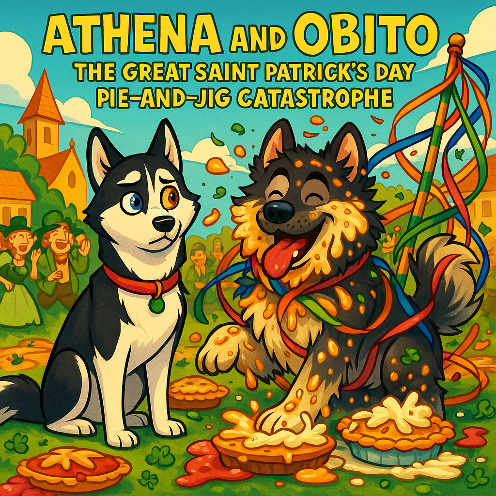 The morning after the Great Shamrock Shenanigans dawned calm. Too calm, Athena noted. Blue and chestnut eyes scanned the village square from the safety of the porch. Obito, already wagging his enormous tail like a furry metronome possessed by an Irish leprechaun, sniffed the air and barked. Athena’s elegant ears flicked back. “Yes, Obito. You’ve sniffed it correctly. Chaos is indeed in the air.”