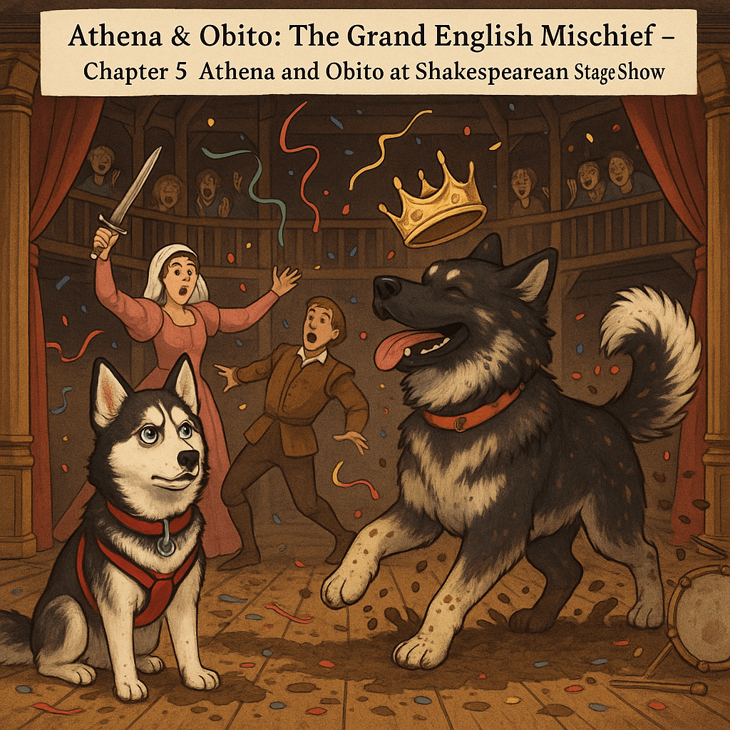 Stratford-upon-Avon glimmered in the morning sun like a quaint painting that whispered, “Culture lives here, and humans expect polite behavior.” Athena padded along the cobbled streets with the dignity of a queen visiting her loyal subjects. Each step was measured, each glance precise. She had one goal for the day: to witness a Shakespeare performance in all its dramatic grandeur, to savor the cadence of iambic pentameter, and perhaps even shed a tear during a tragic soliloquy. Obito, on the other paw, interpreted the word “Shakespeare” entirely differently. To him, it meant “a stage full of props to chew, humans to chase, and costumes to climb.” He bounced along like a fur-covered cannonball, nose twitching at every discarded feather, ribbon, and suspiciously round pebble. Athena sighed deeply and considered tying him to a lamppost, but she knew better, Obito did not obey simple logic. The theater itself was a jewel of Elizabethan charm, with its wooden beams, red velvet curtains, and the faint smell of centuries-old rosin and candle wax mixed with what Athena suspected might be sausage rolls. She glided inside with graceful paws, whiskers twitching, ears pricked. The audience murmured politely, the actors warmed up, and somewhere backstage a lone stagehand whispered fervent prayers that no dogs would appear tonight. Naturally, Obito had other plans. He had already discovered a dropped prop sword, a basket of feathered hats, and an unguarded stack of scripts. Athena tried a gentle nudge. Obito responded by tossing a script into the air and leaping to catch it, rolling across the stage in a way that resembled a tornado colliding with a ballerina. Athena groaned audibly, while the front row of humans instinctively ducked, spilling tea, biscuits, and one very suspicious cat. The curtain rose, and Athena settled elegantly into her seat, ears forward, trying to project the image of refined poise. Obito, however, had other ideas. He launched himself onto the stage in full dramatic mode, tail wagging like a rudderless ship in a storm. “Romeo and Mudliet,” as Athena would later call it, had officially begun. He grabbed the crown prop, tossed it into the air, and caught it again in a display of chaotic brilliance. Athena darted across the stage, attempting a delicate rescue while simultaneously dodging flying confetti, ribbons, and one very indignant chicken that had wandered in from the courtyard. Obito, not to be outdone, began improvising soliloquies. He barked at inanimate objects, howled at imaginary rival lords, and performed death scenes that involved rolling, tumbling, and shedding more confetti than a royal wedding could ever hope to manage. The actors, initially horrified, soon realized that adapting to Obito’s theatrics was their only hope. Juliet raised a dagger high, only to find Obito sniffing it curiously and then leaping dramatically onto the balcony railing, teetering like a furry acrobat. Athena, ever the epitome of canine diplomacy, executed what could only be described as a combination of ballet, mid-air rescue, and stern lecture, all while maintaining as much dignity as was humanly, or canine-ly possible. The audience’s reactions varied from tears of laughter to gasps of disbelief. One elderly man whispered, “I think Shakespeare would have approved,” while a teenager filmed the chaos for TikTok, instantly creating a viral sensation that would later be called #MudlietMadness. Athena rolled her eyes, but even she had to admit the sight of Obito tangled in ropes, prop swords, and one very confused rooster was spectacular in its absurdity. Obito’s crowning achievement came during the climactic balcony scene. Attempting to enact Romeo’s heartfelt confession, he leapt from Juliet’s balcony into the arms of the lead actor, who collapsed dramatically under the combined weight of actor and hound. Athena, recognizing impending disaster, performed the “Husky Ballet of Disaster Recovery,” sliding across the stage to intercept Obito mid-air and somehow landing both of them atop the drum set. The resulting sound could only be described as a percussive symphony of chaos, applause, and one horrified director screaming, “Cut! CUT!” By the time the show ended, Athena and Obito had created a masterpiece of delightful pandemonium. Props were flying through the air, the lead actor’s soliloquy had been transformed into a barking duet, ribbons, mud, and confetti coated every available surface, and the audience rose in a standing ovation, half-hysterical, half-stunned, and entirely entertained. Athena shook her fur, leaving a trail of mud that would haunt the theater janitors for weeks, while Obito rolled in the remains of the curtain as though it were a personal trophy. Athena pressed a dignified paw to his shoulder. “You are impossible,” she said, dripping mud and glitter, “but somehow…remarkably brilliant.” Obito barked proudly, then chased a rogue feather into the wings, leaving Athena alone to soak in the glory of their very own Shakespearean triumph. Somewhere, Shakespeare’s ghost probably sighed, muttered something about “hounds with better timing than actors,” and retired to a foggy corner to nurse his bewilderment. Athena, paws muddied and dignity slightly compromised, realized that true culture was not measured by quiet contemplation or perfect diction, but by laughter, chaos, mud, and the undeniable fact that no stage could survive Obito’s energy intact.
